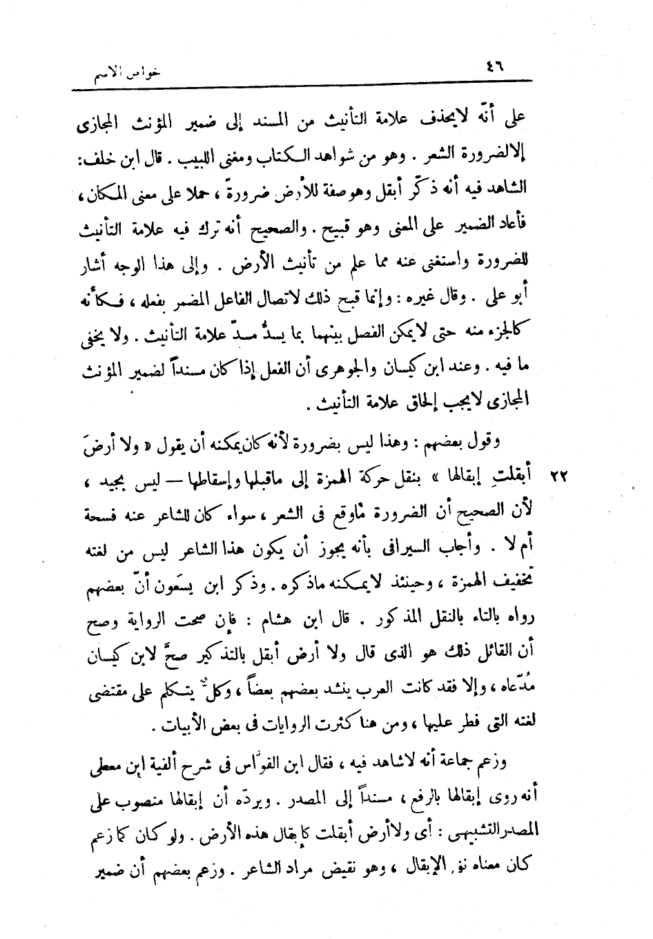 على أَنه لَا يحذف عَلامَة التَّأْنِيث من الْمسند إِلَى ضمير الْمُؤَنَّث الْمجَازِي إِلَّا لضَرُورَة الشّعْر وَهُوَ من شَوَاهِد الْكتاب وَمُغْنِي اللبيب قَالَ ابْن خلف الشَّاهِد فِيهِ أَنه ذكر أبقل وَهُوَ صفة للْأَرْض ضَرُورَة حملا على معنى الْمَكَان فَأَعَادَ الضَّمِير على الْمَعْنى وَهُوَ قَبِيح وَالصَّحِيح أَنه ترك فِيهِ عَلامَة التَّأْنِيث للضَّرُورَة وَاسْتغْنى عَنهُ مِمَّا علم من تَأْنِيث الأَرْض وَإِلَى هَذَا الْوَجْه أَشَارَ أَبُو عَليّ وَقَالَ غَيره وَإِنَّمَا قبح ذَلِك لاتصال الْفَاعِل الْمُضمر بِفِعْلِهِ فَكَأَنَّهُ كالجزء مِنْهُ حَتَّى لَا يُمكن الْفَصْل بَينهمَا بِمَا يسد مسد عَلامَة التَّأْنِيث وَلَا يخفي مَا فِيهِ وَعند ابْن كيسَان والجوهري أَن الْفِعْل إِذا كَانَ مُسْندًا لضمير الْمُؤَنَّث الْمجَازِي لَا يجب إِلْحَاق عَلامَة التَّأْنِيث وَقَول بَعضهم وَهَذَا لَيْسَ بضرورة لِأَنَّهُ كَانَ يُمكنهُ أَن يَقُول وَلَا أَرض أبقلت إبقالها بِنَقْل حَرَكَة الْهمزَة إِلَى مَا قبلهَا وإسقاطها لَيْسَ بجيد لِأَن الصَّحِيح أَن الضَّرُورَة مَا وَقع فِي الشّعْر سَوَاء كَانَ للشاعر عَنهُ فسحة أم لَا وَأجَاب السيرافي بِأَنَّهُ يجوز أَن يكون هَذَا الشَّاعِر لَيْسَ من لغته تَخْفيف الْهمزَة وَحِينَئِذٍ لَا يُمكنهُ مَا ذكره وَذكر ابْن يسعون أَن بَعضهم رَوَاهُ بِالتَّاءِ بِالنَّقْلِ الْمَذْكُور وَقَالَ ابْن هِشَام فَإِن صحت الرِّوَايَة وَصَحَّ أَن الْقَائِل ذَلِك هُوَ الَّذِي قَالَ وَلَا أَرض أبقل بالتذكير صَحَّ لِابْنِ كيسَان مدعاه وَإِلَّا فقد كَانَت الْعَرَب ينشد بَعضهم بَعْضًا وكل يتَكَلَّم على مُقْتَضى لغته الَّتِي فطر عَلَيْهَا وَمن هُنَا كثرت الرِّوَايَات فِي بعض الأبيات وَزعم جمَاعَة أَنه لَا شَاهد فِيهِ فَقَالَ ابْن القواس فِي شرح ألفية ابْن معطي أَنه روى إبقالها بِالرَّفْع مُسْندًا إِلَى الْمصدر وَيَردهُ أَن إبقالها مَنْصُوب على الْمصدر التشبيهي أَي وَلَا أَرض أبقلت كإبقال هَذِه الأَرْض وَلَو كَانَ كَمَا زعم كَانَ مَعْنَاهُ نفي الإبقال وَهُوَ نقيض مُرَاد الشَّاعِر وَزعم بَعضهم أَن ضمير