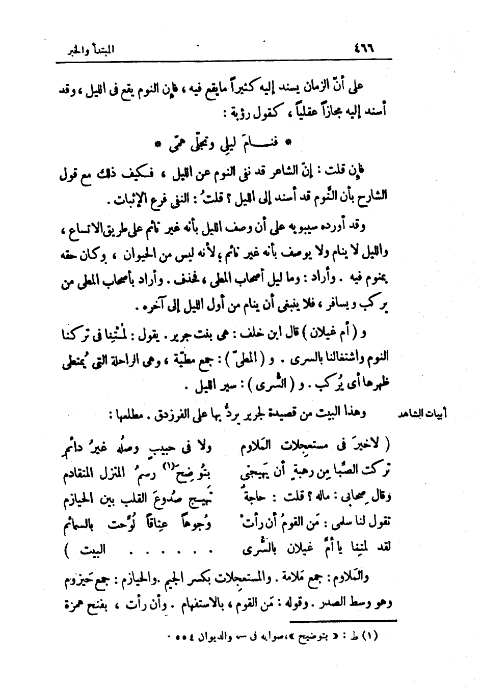 فَإِن قلت إِن الشَّاعِر قد نفى النّوم عَن اللَّيْل فَكيف ذَلِك مَعَ قَول الشَّارِح بِأَن النّوم قد أسْند إِلَى اللَّيْل قلت النَّفْي فرع الْإِثْبَات وَقد أوردهُ سِيبَوَيْهٍ على أَن وصف اللَّيْل بِأَنَّهُ غير نَائِم على طَرِيق الاتساع وَاللَّيْل لَا ينَام وَلَا يُوصف بِأَنَّهُ غير نَائِم لِأَنَّهُ لَيْسَ من الْحَيَوَان وَكَانَ حَقه بمنوم فِيهِ وَأَرَادَ وَمَا ليل أَصْحَاب الْمطِي فَحذف وَأَرَادَ بأصحاب الْمطِي من يركب ويسافر فَلَا يَنْبَغِي أَن ينَام من أول اللَّيْل إِلَى آخِره وَأم غيلَان قَالَ ابْن خلف هِيَ بنت جرير يَقُول لمتنا فِي تركنَا النّوم واشتغالنا بالسرى والمطي جمع مَطِيَّة وَهِي الرَّاحِلَة الَّتِي يمتطى ظهرهَا أَي يركب والسرى سير اللَّيْل وَهَذَا الْبَيْت من قصيدة لجرير يرد بهَا على الفرزدق مطْلعهَا (الطَّوِيل)