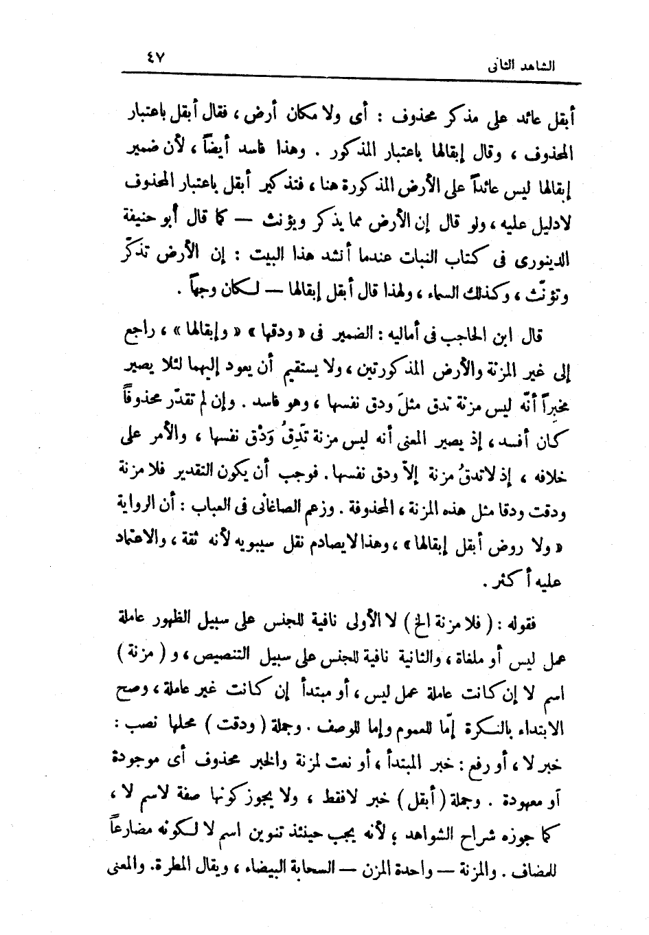 لَكَانَ وَجها قَالَ ابْن الْحَاجِب فِي أَمَالِيهِ الضَّمِير فِي ودقها وإبقالها رَاجع إِلَى غير المزنة وَالْأَرْض المذكورتين وَلَا يَسْتَقِيم أَن يعود إِلَيْهِمَا لِئَلَّا يصير مخبرا أَنه لَيْسَ مزنة تدق مثل ودق نَفسهَا وَهُوَ فَاسد وَإِن لم تقدر محذوفا كَانَ أفسد إِذْ يصير الْمَعْنى أَنه لَيْسَ مزنة تدق ودق نَفسهَا وَالْأَمر على خِلَافه إِذْ لَا تدق مزنة إِلَّا ودق نَفسهَا فَوَجَبَ أَن يكون التَّقْدِير فَلَا مزنة ودقت ودقا مثل هَذِه المزنة المحذوفة وَزعم الصَّاغَانِي فِي الْعباب أَن الرِّوَايَة وَلَا روض أبقل إباقلها وَهَذَا لَا يصادم نقل سِيبَوَيْهٍ لِأَنَّهُ ثِقَة والاعتماد عَلَيْهِ أَكثر فَقَوله فَلَا مزنة الخ لَا الأولى نَافِيَة للْجِنْس على سَبِيل الظُّهُور عاملة عمل لَيْسَ أَو ملغاة وَالثَّانيَِة نَافِيَة للْجِنْس على سَبِيل التَّنْصِيص ومزنة اسْم لَا إِن كَانَت عاملة عمل لَيْسَ أَو مُبْتَدأ إِن كَانَت غير عاملة وَصَحَّ الِابْتِدَاء بالنكرة إِمَّا للْعُمُوم وَإِمَّا للوصف وَجُمْلَة ودقت محلهَا نصب خبر لَا أَو رفع خبر الْمُبْتَدَأ أَو نعت ل مزنة وَالْخَبَر مَحْذُوف أَي مَوْجُودَة أَو معهودة وَجُمْلَة أبقل خبر لَا فَقَط وَلَا يجوز كَونهَا صفة لاسم لَا كَمَا جوزه شرَّاح الشواهد لِأَنَّهُ يجب حِينَئِذٍ تَنْوِين اسْم لَا لكَونه مضارعا للمضاف والمزنة وَاحِدَة المزن السحابة الْبَيْضَاء وَيُقَال المطرة وَالْمعْنَى