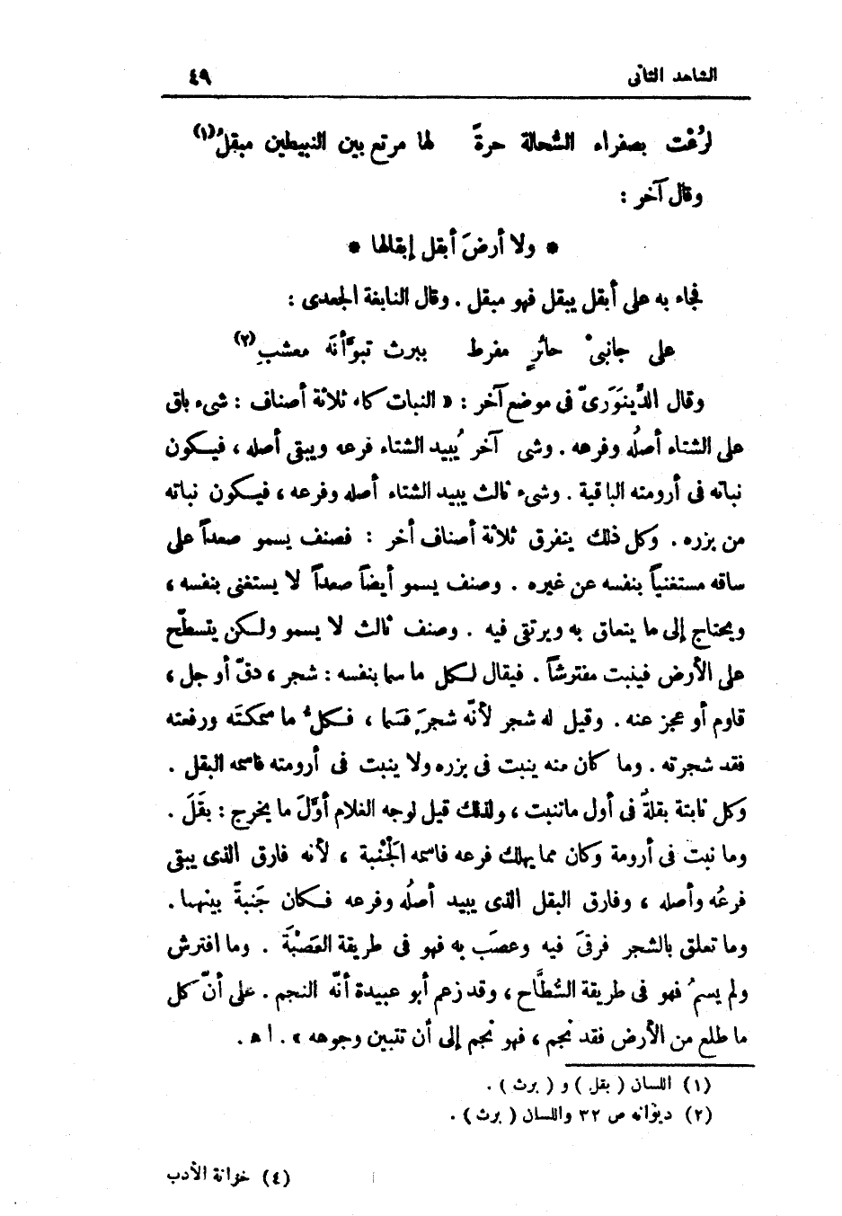 وَقَالَ الدينَوَرِي فِي مَوضِع آخر النَّبَات كُله ثَلَاثَة أَصْنَاف شَيْء بَاقٍ على الشتَاء أَصله وفرعه وَشَيْء آخر يبيد الشتَاء فَرعه وَيبقى أَصله فَيكون نَبَاته فِي أرومته الْبَاقِيَة وَشَيْء ثَالِث يبيد الشتَاء أَصله وفرعه فَيكون نَبَاته من بزره وكل