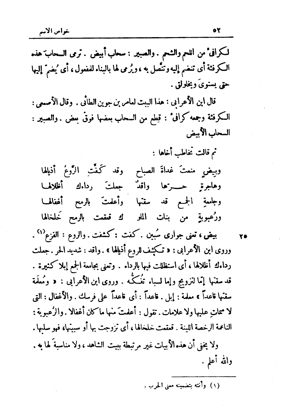 لكرافئ من اللَّحْم والشحم. و" يَرْمِي لَهَا " بِالْبِنَاءِ للْمَفْعُول، أَي: يضم إِلَيْهَا حَتَّى يَسْتَوِي ويخلولق. قَالَ ابْن الْأَعرَابِي: هَذَا الْبَيْت لعامر بن جُوَيْن الطَّائِي. وَقَالَ الْأَصْمَعِي: الْكُوفَة وَجمعه كرافئ: قطع من السَّحَاب بَعْضهَا فَوق بعض. والصبير: السَّحَاب الْأَبْيَض. ثمَّ قَالَت تخاطب أخاها: