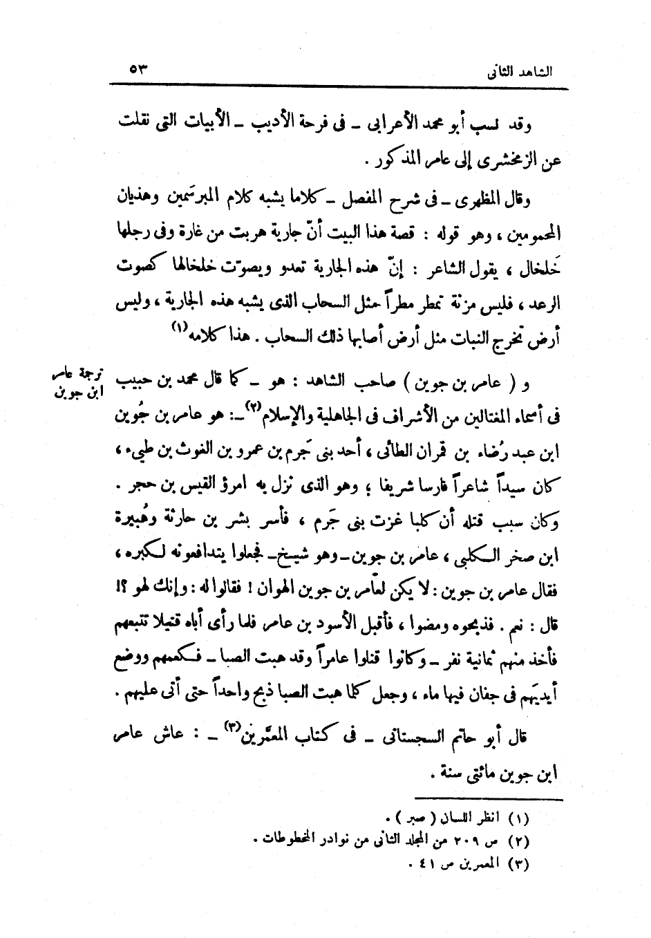 وَقد نسب أَبُو مُحَمَّد الْأَعرَابِي فِي فرحة الأديب الأبيات الَّتِي نقلت عَن الزَّمَخْشَرِيّ إِلَى عَامر الْمَذْكُور