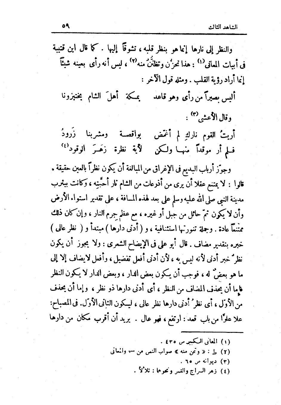 وَالنَّظَر إِلَى نارها إِنَّمَا هُوَ بِنَظَر قلبه تشوقا إِلَيْهَا كَمَا قَالَ ابْن قُتَيْبَة فِي أَبْيَات الْمعَانِي هَذَا تحزن وتظنن مِنْهُ لَيْسَ أَنه رأى بِعَيْنِه شَيْئا إِنَّمَا أَرَادَ رُؤْيَة الْقلب