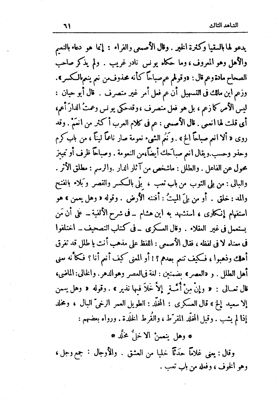 يَدْعُو لَهَا بالسقيا وَكَثْرَة الْخَيْر وَقَالَ الْأَصْمَعِي وَالْفراء إِنَّمَا هُوَ دُعَاء بالنعيم والأهل وَهُوَ الْمَعْرُوف وَمَا حَكَاهُ يُونُس نَادِر غَرِيب وَلم يذكر صَاحب الصِّحَاح مَادَّة وَعم قَالَ وَقَوْلهمْ عَم صباحا كَأَنَّهُ مَحْذُوف من نعم ينعم بِالْكَسْرِ وَزعم ابْن مَالك فِي التسهيل أَن عَم فعل أَمر غير متصرف قَالَ أَبُو حَيَّان لَيْسَ الْأَمر كَمَا زعم بل هُوَ فعل متصرف وَقد حكى يُونُس وعمت الدَّار أَعم أَي قلت لَهَا انعمي قَالَ الْأَصْمَعِي عَم فِي كَلَام الْعَرَب أَكثر من انْعمْ وَقد روى أَلا انْعمْ صباحا الخ وَنعم الشَّيْء نعومة صَار نَاعِمًا لينًا من بَاب كرم وحذر وَحسب وَيُقَال انْعمْ صباحك أَيْضا من النعومة وصباحا ظرف أَو تَمْيِيز محول عَن الْفَاعِل والطلل مَا شخص من آثَار الدَّار والرسم مُطلق الْأَثر والبالي من بلي الثَّوْب من بَاب تَعب بلَى بِالْكَسْرِ وَالْقصر وبلاء بِالْفَتْح وَالْمدّ خلق أَو من بلي الْمَيِّت أفنته الأَرْض وَقَوله وَهل يعمن هُوَ اسْتِفْهَام إنكاري اسْتشْهد بِهِ ابْن هِشَام فِي شرح الألفية على أَن من يسْتَعْمل فِي غير الْعُقَلَاء وَقَالَ العسكري فِي كتاب التَّصْحِيف اخْتلفُوا فِي مَعْنَاهُ لَا فِي لَفظه فَقَالَ الْأَصْمَعِي اللَّفْظ على مَذْهَب أَنْت يَا طلل قد تفرق أهلك وذهبوا فَكيف تنعم بعدهمْ أَو الْمَعْنى كَيفَ أنعم أَنا فَكَأَنَّهُ يَعْنِي أهل الطلل وَالْعصر بِضَمَّتَيْنِ لُغَة فِي الْعَصْر وَهُوَ الدَّهْر والخالي الْمَاضِي قَالَ تَعَالَى {وَإِن من أمة إِلَّا خلا فِيهَا نَذِير} وَقَوله وَهل يعمن إِلَّا سعيد إِلَخ قَالَ العسكري المخلد الطَّوِيل الْعُمر الرخي البال ومخلد إِذا لم يشب وَقيل المخلد المقرط والقرط الخلدة وَرَوَاهُ بَعضهم