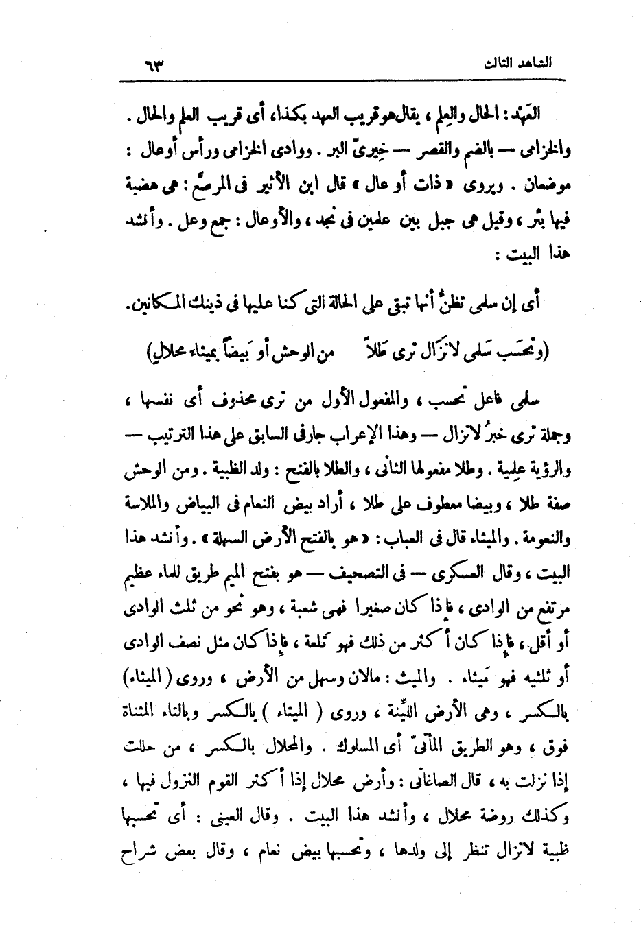 سلمى فَاعل تحسب وَالْمَفْعُول الأول من ترى مَحْذُوف أَي نَفسهَا جملَة ترى خبر لَا تزَال وَهَذَا الْإِعْرَاب جَار فِي السَّابِق على هَذَا التَّرْتِيب والرؤية علمية وطلا مفعولها الثَّانِي والطلا بِالْفَتْح ولد الظبية وَمن الْوَحْش صفة طلا وبيضا مَعْطُوف على طلا أَرَادَ بيض النعام فِي الْبيَاض والملاسة والنعومة والميثاء قَالَ فِي الْعباب هُوَ بِالْفَتْح الأَرْض السهلة وَأنْشد هَذَا الْبَيْت وَقَالَ العسكري فِي التَّصْحِيف هُوَ بِفَتْح الْمِيم طَرِيق للْمَاء عَظِيم مُرْتَفع من الْوَادي فَإِذا كَانَ صَغِيرا فَهِيَ شُعْبَة وَهُوَ نَحْو من ثلث الْوَادي أَو أقل فَإِذا كَانَ أَكثر من ذَلِك فَهُوَ تلعة فَإِذا كَانَ مثل نصف الْوَادي أَو ثُلثَيْهِ فَهُوَ ميثاء والميث مَا لِأَن وَسَهل من الأَرْض وَرُوِيَ الميثاء بِالْكَسْرِ وَهِي الأَرْض اللينة وَرُوِيَ الميتاء بِالْكَسْرِ وبالتاء الْمُثَنَّاة فَوق وَهُوَ الطَّرِيق المأتي أَي المسلوك والمحلال بِالْكَسْرِ من حللت إِذا نزلت بِهِ قَالَ الصَّاغَانِي وَأَرْض محلال إِذا أَكثر الْقَوْم النُّزُول فِيهَا وَكَذَلِكَ رَوْضَة محلال وَأنْشد هَذَا الْبَيْت وَقَالَ الْعَيْنِيّ أَي تحسبها ظَبْيَة لَا تزَال تنظر إِلَى وَلَدهَا وتحسبها بيض نعام وَقَالَ بعض شرَّاح