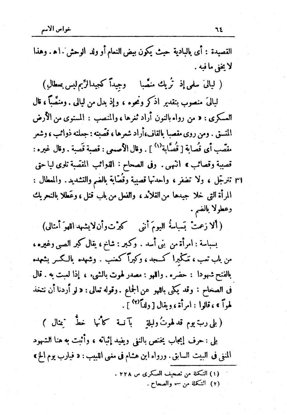 بسباسة امْرَأَة من بني أَسد وَكبر شاخ يُقَال كبر الصَّبِي وَغَيره من بَاب تَعب مكبرا كمسجد وكبرا كعنب وشهده بِالْكَسْرِ يشهده بِالْفَتْح شُهُودًا حَضَره وَاللَّهْو مصدر لهوت بالشَّيْء إِذا لعبت بِهِ قَالَ فِي الصِّحَاح وَقد يكنى باللهو عَن الْجِمَاع وَقَوله تَعَالَى (لَو أردنَا أَن نتَّخذ لهوا قَالُوا) أمْرَأَة وَيُقَال ولدا