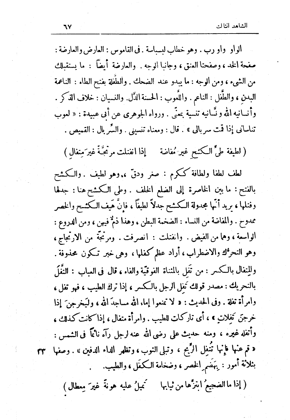 الْوَاو وَاو رب وَهُوَ خطاب لبسباسة فِي الْقَامُوس الْعَارِض والعارضة صفحة الخد وصفحتا الْعُنُق وجانبا الْوَجْه والعارضة أَيْضا مَا يستقبلك من الشَّيْء وَمن الْوَجْه مَا يَبْدُو عِنْد الضحك والطفلة بِفَتْح الطَّاء الناعمة الْبدن والطفل الناعم واللعوب الْحَسَنَة الدل وَالنِّسْيَان خلاف الذّكر وأنسانية الله ونسانيه تنسية بِمَعْنى وَرَوَاهُ الْجَوْهَرِي عَن أبي عُبَيْدَة لعوب تناساني إِذا قُمْت سربالي قَالَ وَمَعْنَاهُ تنسيني والسربال الْقَمِيص