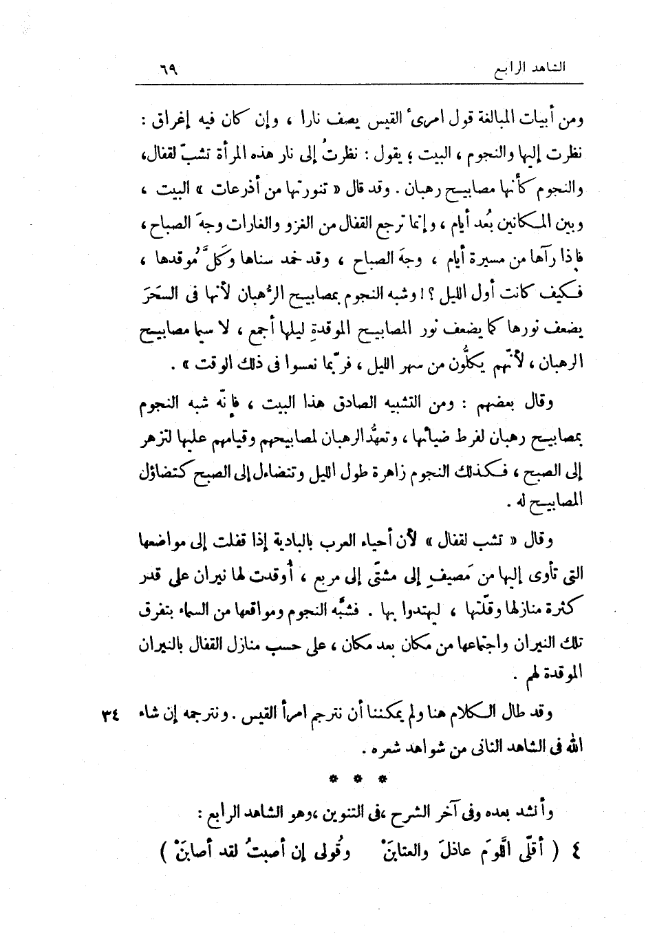 وَقَالَ بَعضهم وَمن التَّشْبِيه الصَّادِق هَذَا الْبَيْت فَإِنَّهُ شبه النُّجُوم بمصابيح رُهْبَان لفرط ضيائها وتعهد الرهبان لمصابيحهم وقيامهم عَلَيْهَا لتزهر إِلَى الصُّبْح فَكَذَلِك النُّجُوم زاهرة طول اللَّيْل وتتضاءل إِلَى الصُّبْح كتضاؤل المصابيح لَهُ وَقَالَ تشب لقفال لِأَن أَحيَاء الْعَرَب بالبادية إِذا قفلت إِلَى موَاضعهَا الَّتِي تأوي إِلَيْهَا من مصيف إِلَى مشتى إِلَى مربع أوقدت لَهَا نيران على قدر كَثْرَة منازلها وقلتها ليهتدوا بهَا فَشبه النُّجُوم ومواقعها من السَّمَاء بتفرق تِلْكَ النيرَان واجتماعها من مَكَان بعد مَكَان على حسب منَازِل الْقفال بالنيران الموقدة لَهُم وَقد طَال الْكَلَام هُنَا وَلم يمكننا أَن نترجم امرا الْقَيْس ونترجمه إِن شَاءَ الله فِي الشَّاهِد الثَّانِي من شَوَاهِد شعره