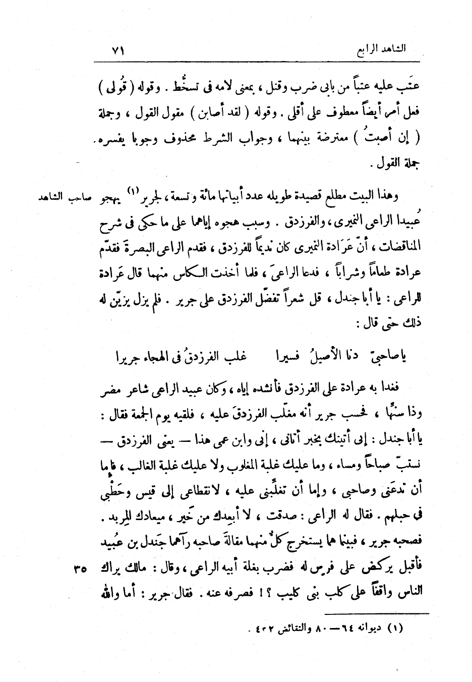 فغدا بِهِ عَرَادَة على الفرزدق فأنشده إِيَّاه وَكَانَ عبيد الرَّاعِي شَاعِر مُضر وَذَا سنّهَا فَحسب جرير أَنه مغلب الفرزدق عَلَيْهِ فَلَقِيَهُ يَوْم الْجُمُعَة فَقَالَ يَا أَبَا جندل إِنِّي أَتَيْتُك بِخَبَر أَتَانِي إِنِّي وَابْن عمي هَذَا يَعْنِي الفرزدق نستب صباحا وَمَسَاء وَمَا عَلَيْك غَلَبَة المغلوب وَلَا عَلَيْك غَلَبَة الْغَالِب فإمَّا أَن تدعني وصاحبي وَإِمَّا أَن تغلبني عَلَيْهِ لانقطاعي إِلَى قيس وحطي فِي حبلهم فَقَالَ لَهُ الرَّاعِي صدقت لَا أبعدك من خير ميعادك المربد فصحبه جرير فَبَيْنَمَا هما يسْتَخْرج كل مِنْهُمَا مقَالَة صَاحبه رآهما جندل بن عبيد فَأقبل يرْكض على فرس لَهُ فَضرب بغلة أَبِيه الرَّاعِي وَقَالَ مَالك يراك النَّاس وَاقِفًا على كلب بني كُلَيْب فَصَرفهُ عَنهُ فَقَالَ جرير أما وَالله