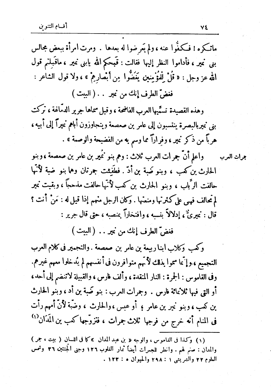 (الْبَيْت) وَكَعب وكلاب ابْنا ربيعَة بن عَامر بن صعصعة والتجمير فِي كَلَام الْعَرَب التجميع وَإِنَّمَا سموا بذلك لأَنهم متوافرون فِي أنفسهم لم يدخلُوا مَعَهم غَيرهم وَفِي الْقَامُوس الْجَمْرَة النَّار المتقدة وَألف فَارس والقبيلة لَا تنضم إِلَى أحد أَو الَّتِي فِيهَا ثَلَاثمِائَة فَارس وجمرات الْعَرَب بَنو ضبة بن أد وَبَنُو الْحَارِث بن كَعْب وَبَنُو نمير بن عَامر أَو عبس والْحَارث وضبة لِأَن أمّهم رَأَتْ فِي الْمَنَام أَنه خرج من فرجهَا ثَلَاث جمرات فَتَزَوجهَا كَعْب بن عبد المدان
