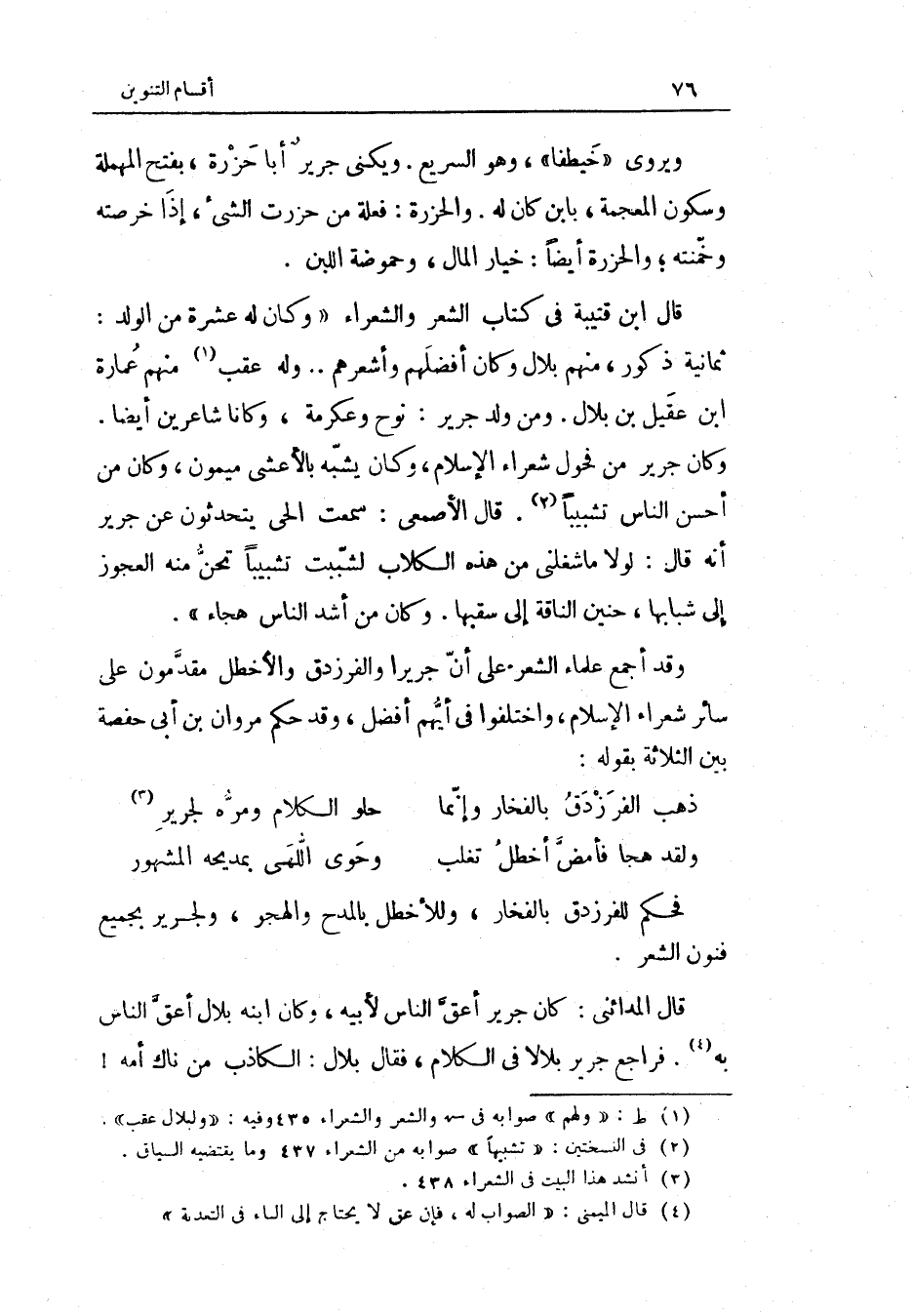 فَحكم للفرزدق بالفخار وللأخطل بالمدح والهجو ولجرير بِجَمِيعِ فنون الشّعْر قَالَ الْمَدَائِنِي كَانَ جرير أعق النَّاس لِأَبِيهِ وَكَانَ أبنه بِلَال أعق النَّاس بِهِ فراجع جرير بِلَالًا فِي الْكَلَام فَقَالَ بِلَال الْكَاذِب من ناك أمه