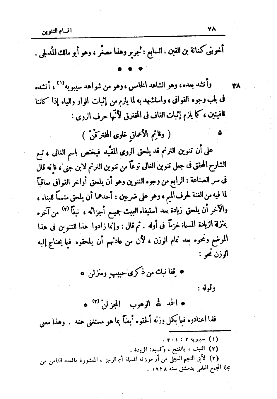 على أَن تَنْوِين الترنم قد يلْحق الروي الْمُقَيد فَيخْتَص باسم الغالي تبع الشَّارِح الْمُحَقق فِي جعل تَنْوِين الغالي نوعا من تَنْوِين الترنم لِابْنِ جني فَإِنَّهُ قَالَ فِي سر الصِّنَاعَة الرَّابِع من وُجُوه التَّنْوِين وَهُوَ أَن يلْحق أَوَاخِر القوافي معاقبا لما فِيهِ من الغنة لحرف الْمِيم وَهُوَ على ضَرْبَيْنِ أَحدهمَا أَن يلْحق متمما للْبِنَاء وَالْآخر أَن يلْحق زِيَادَة بعد اسْتِيفَاء الْبَيْت جَمِيع أَجْزَائِهِ نيفا من آخِره بِمَنْزِلَة الزِّيَادَة الْمُسَمَّاة خزما فِي أَوله ثمَّ قَالَ وَإِنَّمَا زادوا هَذَا التَّنْوِين فِي هَذَا الْموضع وَنَحْوه بعد تَمام الْوَزْن لِأَن من عَادَتهم أَن يلحقوه فِيمَا يحْتَاج إِلَيْهِ الْوَزْن نَحْو