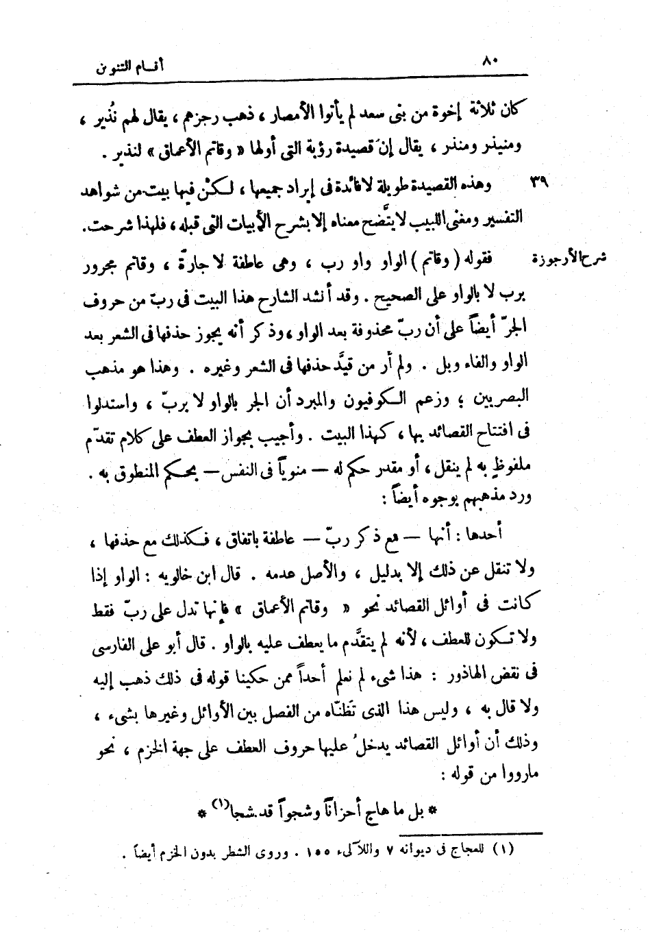 كَانَ ثَلَاثَة إخْوَة من بني سعد لم يَأْتُوا الْأَمْصَار ذهب رجزهم يُقَال لَهُم نَذِير ومنيذر وَمُنْذِر يُقَال إِن قصيدة رؤبة الَّتِي أَولهَا وقاتم الأعماق لنذير وَهَذِه القصيدة طَوِيلَة لَا فَائِدَة فِي إِيرَاد جَمِيعهَا لَكِن فِيهَا بَيت من شَوَاهِد التَّفْسِير وَمُغْنِي اللبيب لَا يَتَّضِح مَعْنَاهُ إِلَّا بشرح الأبيات الَّتِي قبْلَة فَلهَذَا شرحت فَقَوله وقاتم الْوَاو وَاو رب وَهِي عاطفة لَا جَارة وقاتم مجرور بِرَبّ لَا بِالْوَاو على الصَّحِيح وَقد أنْشد الشَّارِح هَذَا الْبَيْت فِي رب من حُرُوف الْجَرّ أَيْضا على أَن رب محذوفة بعد الْوَاو وَذكر أَنه يجوز حذفهَا فِي الشّعْر بعد الْوَاو وَالْفَاء وبل وَلم أر من قيد حذفهَا فِي الشّعْر وَغَيره وَهَذَا هُوَ مَذْهَب الْبَصرِيين وَزعم الْكُوفِيُّونَ والمبرد أَن الْجَرّ ب الْوَاو لَا ب رب وَاسْتَدَلُّوا فِي افْتِتَاح القصائد بهَا كَهَذا الْبَيْت وَأجِيب بِجَوَاز الْعَطف على كَلَام تقدم ملفوظ بِهِ لم ينْقل أَو مُقَدّر حكم لَهُ منويا فِي النَّفس بِحكم الْمَنْطُوق بِهِ ورد مَذْهَبهم بِوُجُوه أَيْضا أَحدهَا أَنَّهَا مَعَ ذكر رب عاطفة بِاتِّفَاق فَكَذَلِك مَعَ حذفهَا وَلَا تنقل عَن ذَلِك إِلَّا بِدَلِيل وَالْأَصْل عَدمه قَالَ ابْن خالويه الْوَاو إِذا كَانَت فِي أَوَائِل القصائد نَحْو وقاتم الأعماق فَإِنَّهَا تدل على رب فَقَط وَلَا تكون للْعَطْف لِأَنَّهُ لم يتَقَدَّم مَا يعْطف عَلَيْهِ بِالْوَاو قَالَ أَبُو عَليّ الْفَارِسِي فِي نقض الهاذور هَذَا شَيْء لم نعلم أحدا مِمَّن حكينا قَوْله فِي ذَلِك ذهب إِلَيْهِ وَلَا قَالَ بِهِ وَلَيْسَ هَذَا الَّذِي تظناه من الْفَصْل بَين الْأَوَائِل وَغَيرهَا بِشَيْء وَذَلِكَ أَن أَوَائِل القصائد يدْخل عَلَيْهَا