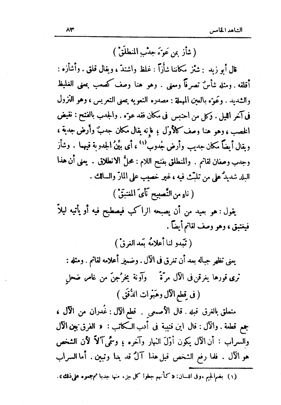 جديب وَأَرْض جدوب أَي بَين الجدوبة فيهمَا وشأز وجدب وصفان لقاتم والمنطلق بِفَتْح اللَّام مَحل الانطلاق يَعْنِي أَن هَذَا الْبَلَد شَدِيد على من تلبث فِيهِ غير خصيب على الْمَار والسالك
