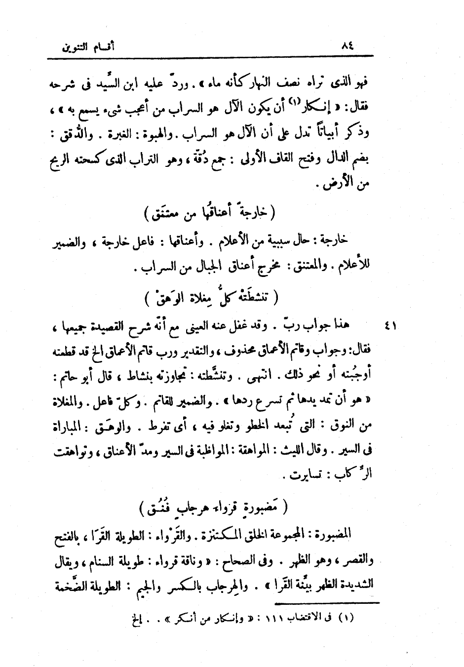 فَهُوَ الَّذِي ترَاهُ نصف النَّهَار كَأَنَّهُ مَاء ورد عَلَيْهِ ابْن السَّيِّد فِي شَرحه فَقَالَ إِنْكَار أَن يكون الْآل هُوَ السراب من أعجب شَيْء يسمع بِهِ وَذكر أبياتا تدل على أَن الْآل هُوَ السراب والهبوة الغبرة والدقق بِضَم الدَّال وَفتح الْقَاف الأولى جمع دقة وَهُوَ التُّرَاب الَّذِي كسحته الرّيح من الأَرْض