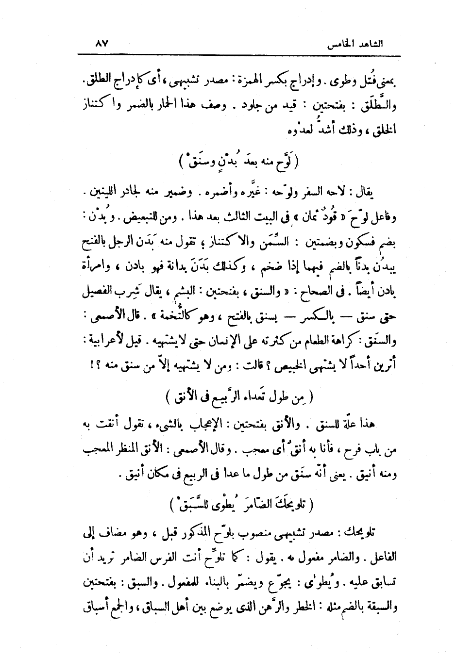 يُقَال لاحه السّفر ولوحه غَيره وأضمره وَضمير مِنْهُ لجادر الليتين وفاعل لوح قَود ثَمَان فِي الْبَيْت الثَّالِث بعد هَذَا وَمن للتَّبْعِيض وبدن بِضَم فَسُكُون وبضمتين السّمن والاكتناز تَقول مِنْهُ بدن الرجل بِالْفَتْح يبدن بدنا بِالضَّمِّ فيهمَا إِذا ضخم وَكَذَلِكَ بدن بدانة فَهُوَ بادن وَامْرَأَة بادن أَيْضا فِي الصِّحَاح والسنق بِفتْحَتَيْنِ البشم يُقَال شرب الفصيل حَتَّى سنق بِالْكَسْرِ يسنق بِالْفَتْح وَهُوَ كالتخمة قَالَ الْأَصْمَعِي والسنق كَرَاهَة الطَّعَام من كثرته على الْإِنْسَان حَتَّى لَا يشتهيه قيل لأعرابية أترين أحدا لَا يَشْتَهِي الخبيص قَالَت وَمن لَا يشتهيه إِلَّا من سنق مِنْهُ