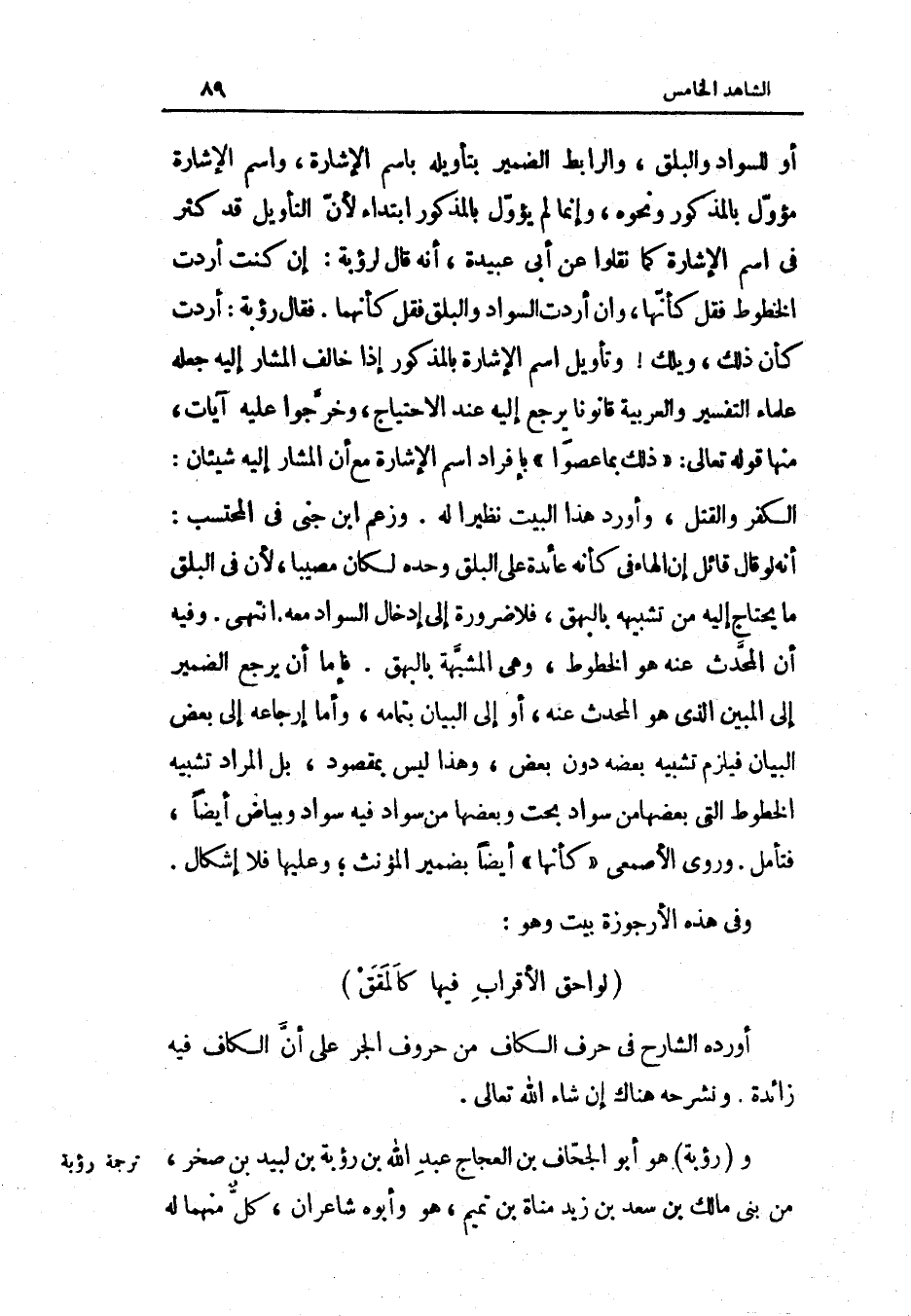 أوردهُ الشَّارِح فِي حرف الْكَاف من حُرُوف الْجَرّ على أَن الْكَاف فِيهِ زَائِدَة ونشرحه هُنَاكَ إِن شَاءَ الله تَعَالَى ورؤبة هُوَ أَبُو الجحاف بن العجاج عبد الله بن رؤبة بن لبيد بن صَخْر من بني مَالك بن سعد بن زيد مَنَاة بن تَمِيم هُوَ وَأَبوهُ شاعران كل مِنْهُمَا لَهُ
