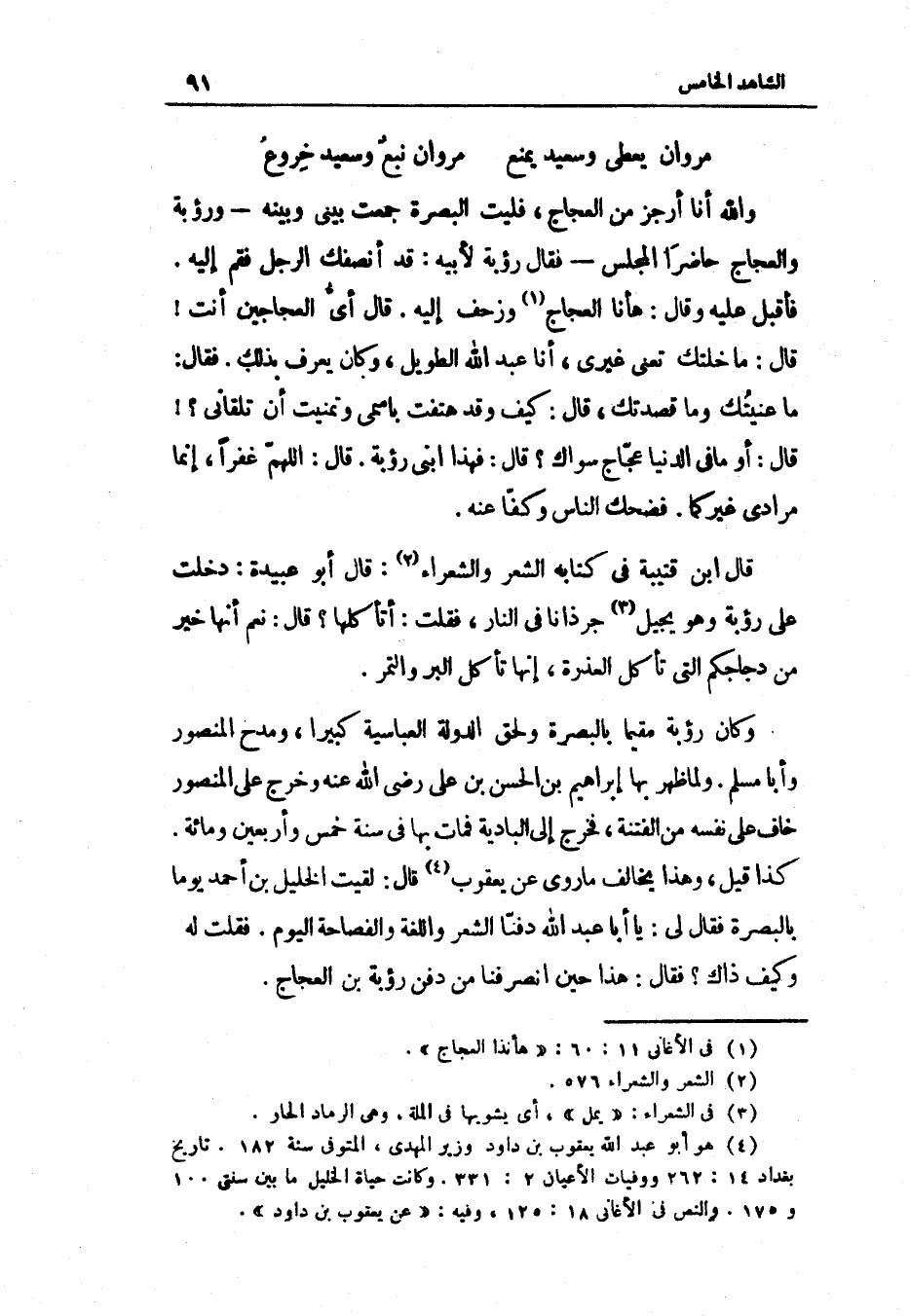 وَالله أَنا أرجز من العجاج فليت الْبَصْرَة جمعت بيني وَبَينه ورؤبة والعجاج حَاضرا الْمجْلس فَقَالَ رؤبة لِأَبِيهِ قد أنصفك الرجل فَقُمْ إِلَيْهِ فَأقبل عَلَيْهِ وَقَالَ هأنا العجاج وزحف إِلَيْهِ قَالَ أَي العجاجين أَنْت قَالَ مَا خلتك تَعْنِي غَيْرِي أَنا عبد الله الطَّوِيل وَكَانَ يعرف بذلك فَقَالَ مَا عنيتك وَمَا قصدتك قَالَ كَيفَ وَقد هَتَفت باسمي وتمنيت أَن تَلقانِي قَالَ أَو مَا فِي الدُّنْيَا عجاج سواك قَالَ فَهَذَا ابْني رؤبة قَالَ اللَّهُمَّ غفرا إِنَّمَا مرادي غيركما فَضَحِك النَّاس وكفا عَنهُ قَالَ ابْن قُتَيْبَة فِي كِتَابه الشّعْر وَالشعرَاء قَالَ أَبُو عُبَيْدَة دخلت على رؤبة وَهُوَ يجيل جرذانا فِي النَّار فَقلت أتأكلها قَالَ نعم إِنَّهَا خير من دجاجكم