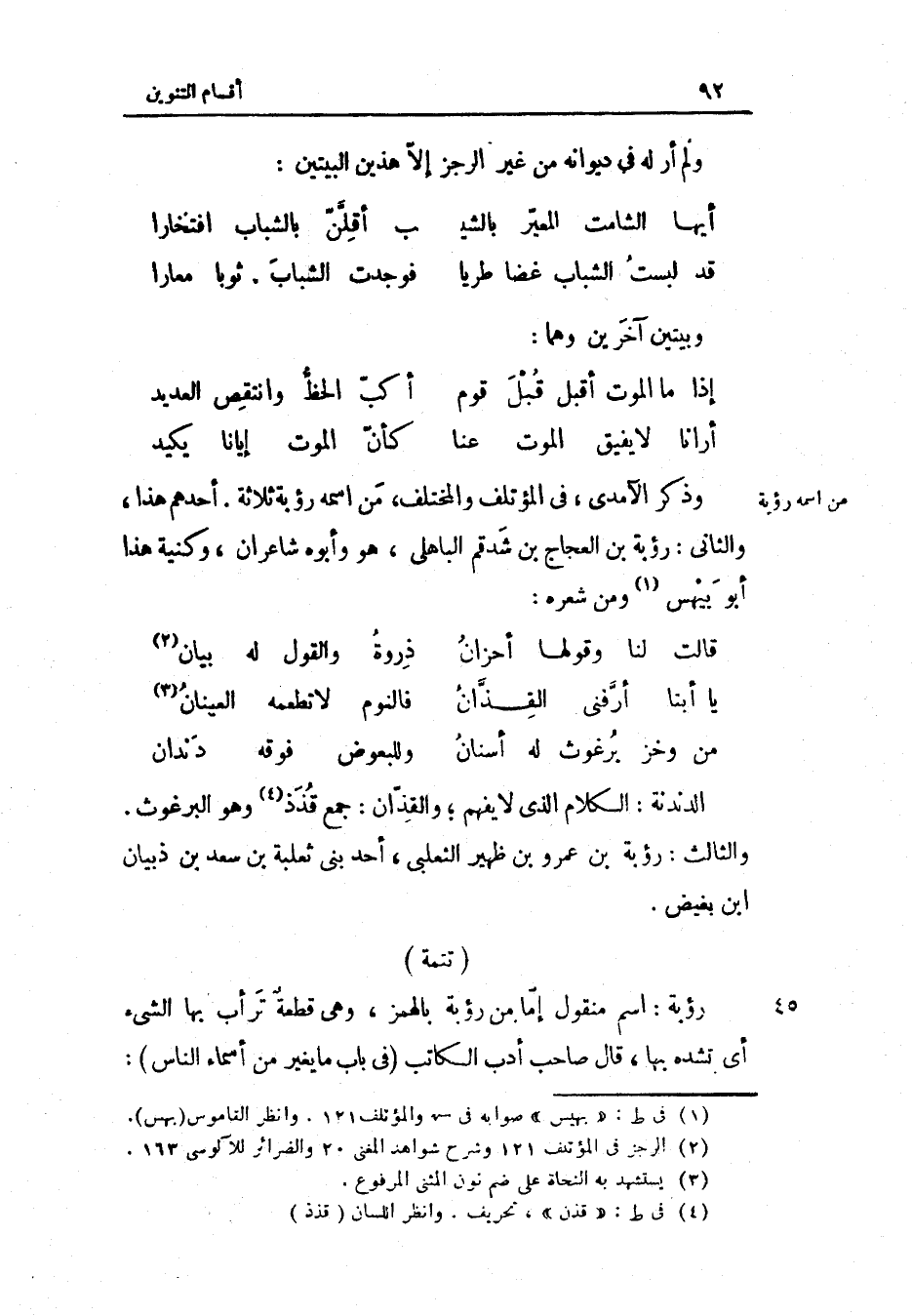 وَذكر الْآمِدِيّ فِي المؤتلف والمختلف من اسْمه رؤبة ثَلَاثَة أحدهم هَذَا وَالثَّانِي رؤبة بن العجاج بن شدقم الْبَاهِلِيّ وَهُوَ وَأَبوهُ شاعران وكنية هَذَا أَبُو بيهس وَمن شعره (الرجز)