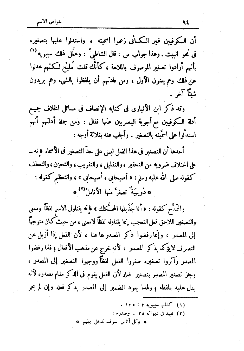 أَن الْكُوفِيّين غير الْكسَائي زَعَمُوا اسميته وَاسْتَدَلُّوا عَلَيْهَا بتصغيره فِي نَحْو الْبَيْت وَهَذَا جَوَاب س قَالَ الشاطبي وَعلل ذَلِك سِيبَوَيْهٍ بِأَنَّهُم أَرَادوا تَصْغِير الْمَوْصُوف بالملاحة كَأَنَّك قلت مليح لكِنهمْ عدلوا عَن ذَلِك وهم يعنون الأول وَمن عَادَتهم أَن يلفظوا بالشَّيْء وهم يُرِيدُونَ شَيْئا آخر وَقد ذكر ابْن الْأَنْبَارِي فِي كِتَابه الْإِنْصَاف فِي مسَائِل الْخلاف جَمِيع أَدِلَّة الْكُوفِيّين مَعَ أجوبة الْبَصرِيين عَنْهَا فَقَالَ وَمن جملَة أدلتهم أَنهم استدلوا على أسميته بِالتَّصْغِيرِ وَأجَاب عَنهُ بِثَلَاثَة أوجه أَحدهَا أَن التصغير فِي هَذَا الْفِعْل لَيْسَ على حد التصغير فِي الْأَسْمَاء فَإِنَّهُ على اخْتِلَاف ضروبه من التحقير والتقليل والتقريب والتحزن والتعطف كَقَوْلِه