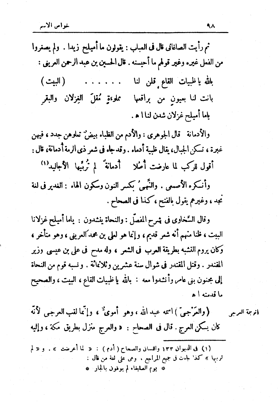 وَغَيرهم يَقُول بِالْفَتْح كَذَا فِي الصِّحَاح وَقَالَ السخاوي فِي شرح الْمفصل والنحاة ينشدون ياما أميلح غزلانا الْبَيْت ظنا مِنْهُم أَنه شعر قديم وَإِنَّمَا هُوَ لعَلي بن مُحَمَّد العريني وَهُوَ مُتَأَخّر وَكَانَ يروم التَّشَبُّه بطريقة الْعَرَب فِي الشّعْر وَله مدح فِي عَليّ بن عِيسَى وَزِير المقتدر وَقتل المقتدر فِي شَوَّال سنة عشْرين وثلاثمائة وَنسبه قوم من النُّحَاة إِلَى مَجْنُون بني عَامر وأنشدوا مَعَه بِاللَّه يَا ظبيات القاع الْبَيْت وَالصَّحِيح مَا قَدمته ا. هـ.