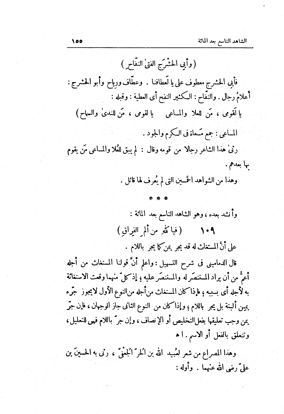 وَأبي الحشرج الْفَتى النفاح فأبي الحشرج مَعْطُوف على يَا لعطفنا. وعطاف ورياح وَأَبُو الحشرج: أَعْلَام رجال. والنفاح: الْكثير النفح أَي: الْعَطِيَّة.
