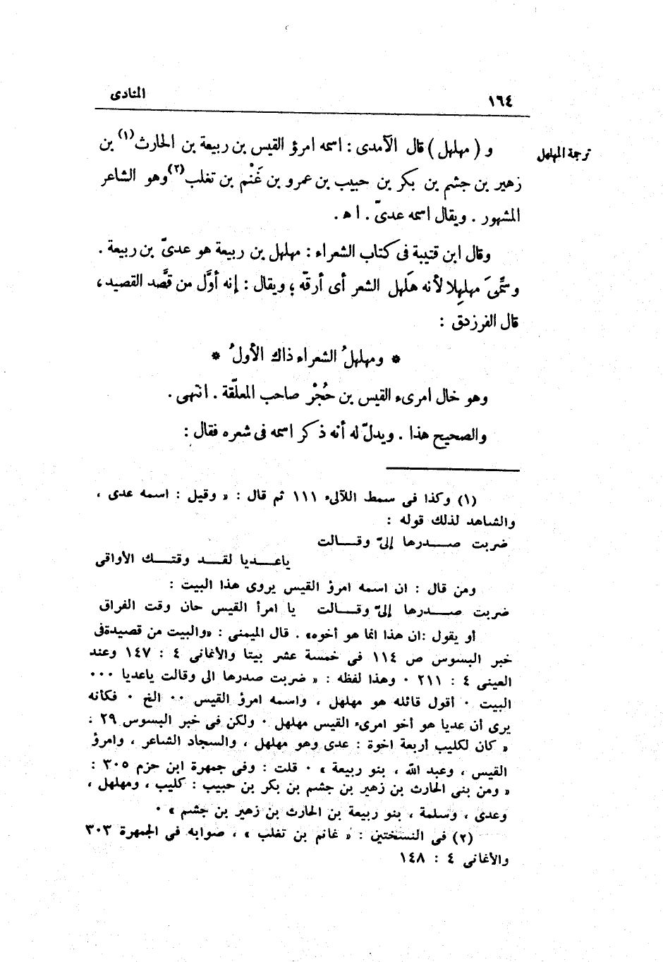 ومهلهل قَالَ الْآمِدِيّ: اسْمه امْرُؤ الْقَيْس بن ربيعَة بن الْحَارِث بن زُهَيْر ابْن جشم بن بكر بن حبيب بن عَمْرو بن غنم بن تغلب وَهُوَ مهلهل الشَّاعِر الْمَشْهُور. وَيُقَال اسْمه عدي.