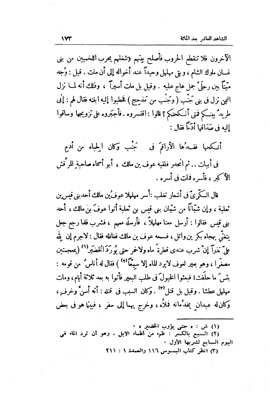 فَقَالُوا: أرسل مَعنا مهلهلاً فَأرْسلهُ مَعَهم فَشرب فَلَمَّا رَجَعَ جعل يتَغَنَّى بِهِجَاء بكر بن وَائِل فَسَمعهُ عَوْف بن مَالك فَغَاظَهُ فَقَالَ: لَا جرم إِن لله عَليّ نذرا إِن شرب عِنْدِي قَطْرَة مَاء وَلَا خمر حَتَّى يُورد الخضير بمعجمتين مُصَغرًا وَهُوَ بعير لعوف لَا يرد المَاء إِلَّا سبعا فَقَالَ لَهُ أنَاس من قومه: بئس مَا حَلَفت فبعثوا)