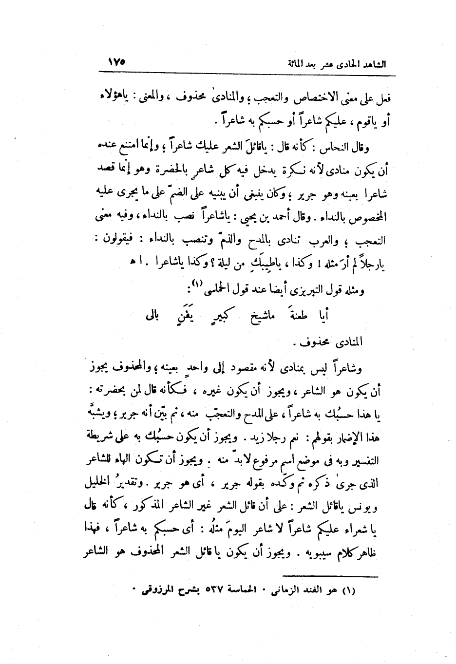 وَقَالَ النّحاس: كَأَنَّهُ قَالَ: يَا قَائِل الشّعْر عَلَيْك شَاعِرًا وَإِنَّمَا امْتنع عِنْده أَن يكون منادى لِأَنَّهُ نكرَة يدْخل فِي كل شَاعِر بالحضرة وَهُوَ إِنَّمَا قصد شَاعِرًا بِعَيْنِه وَهُوَ جرير وَكَانَ يَنْبَغِي أَن يبنيه وَقَالَ أَحْمد بن يحيى: يَا شَاعِرًا نصب بالنداء وَفِيه معنى التَّعَجُّب وَالْعرب تنادي بالمدح والذم وتنصب بالنداء: فَيَقُولُونَ: يَا رجلا لم أر مثله وَكَذَا يَا طيبك من لَيْلَة وَكَذَا يَا شَاعِرًا.