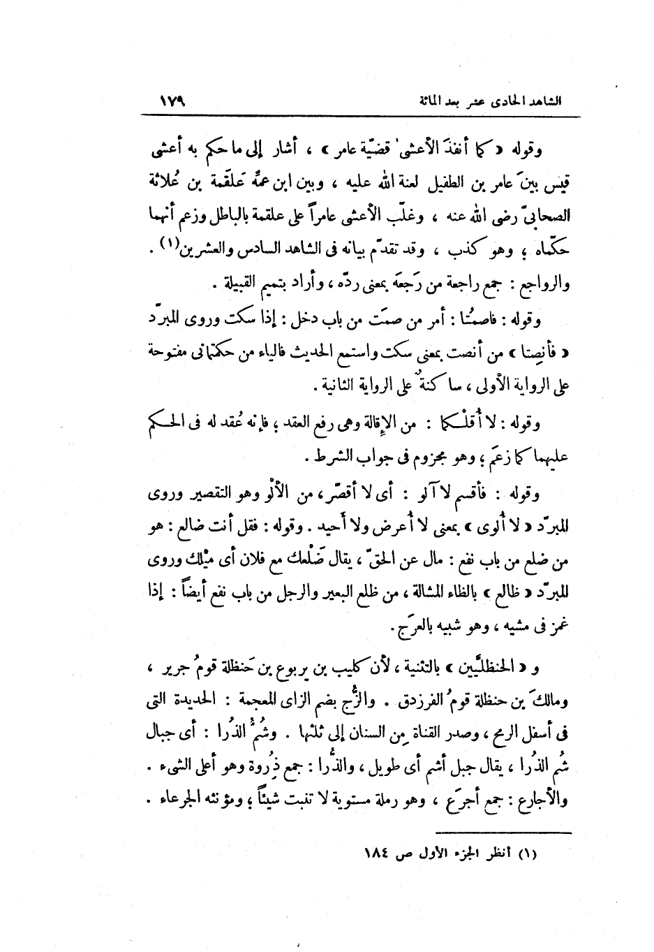 وَقَوله: كَمَا أنفذ الْأَعْشَى قَضِيَّة عَامر أَشَارَ إِلَى مَا حكم بِهِ أعشى قيس بَين عَامر بن الطُّفَيْل لعنة الله عَلَيْهِ وَبَين ابْن عَمه عَلْقَمَة بن علاثة الصَّحَابِيّ رَضِيَ اللَّهُ عَنْه وَغلب الْأَعْشَى عَامِرًا على عَلْقَمَة بِالْبَاطِلِ وَزعم أَنَّهُمَا حكماه وَهُوَ كذب وَقد تقدم بَيَانه فِي الشَّاهِد السَّادِس وَالْعِشْرين. والرواجع: جمع رَاجِعَة من رجعه بِمَعْنى رده وَأَرَادَ بتميم الْقَبِيلَة.