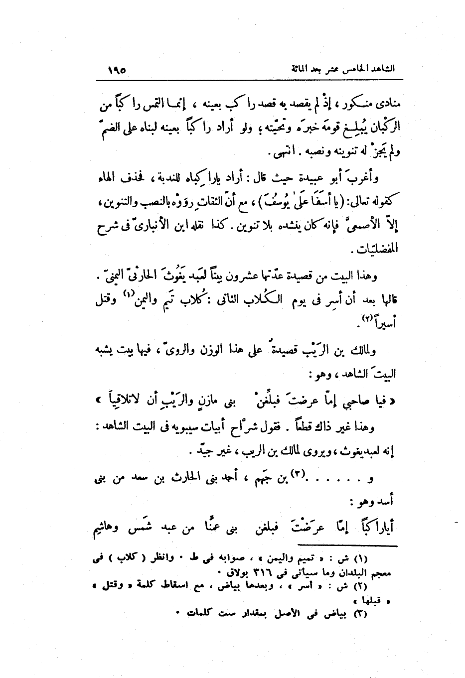 وَهَذَا غير ذَاك قطعا. فَقَوْل شرَّاح أَبْيَات سِيبَوَيْهٍ فِي الْبَيْت الشَّاهِد: إِنَّه لعبد يَغُوث ويروى لمَالِك بن الريب غير جيد. و ... . . بن جهم أحد بني الْحَارِث بن سعد بن بني أَسد وَهُوَ: