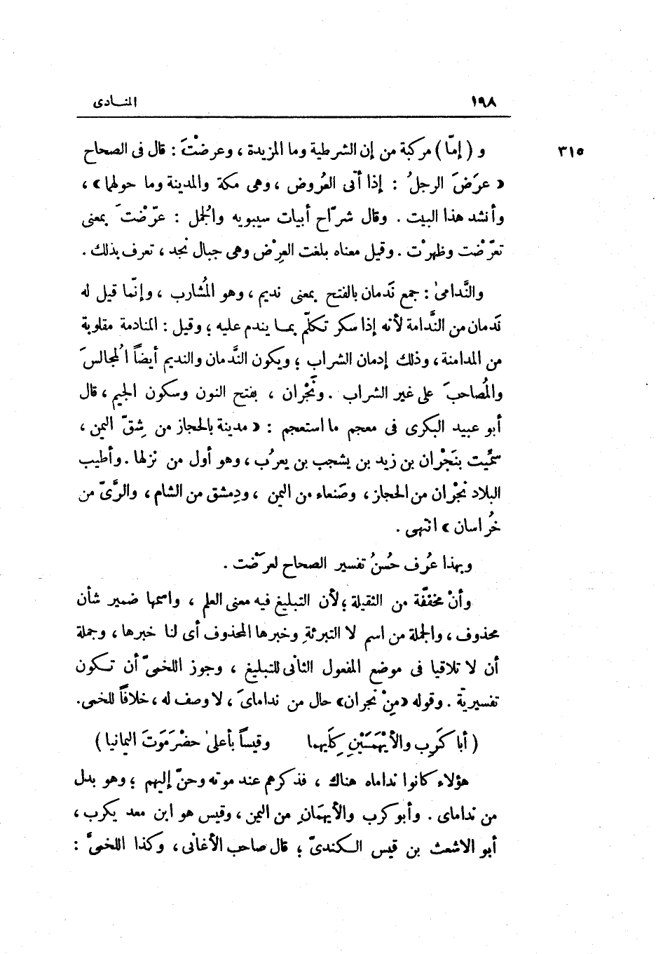 وَقَالَ شرَّاح أَبْيَات سِيبَوَيْهٍ والجمل: عرضت: بِمَعْنى تعرضت وَظَهَرت. وَقيل مَعْنَاهُ بلغت الْعرض وَهِي جبال نجد تعرف بذلك. والندامى: جمع ندمان بِالْفَتْح بِمَعْنى نديم وَهُوَ المشارب وَإِنَّمَا قيل لَهُ ندمان من الندامة لِأَنَّهُ إِذا سكر تكلم بِمَا ينْدَم عَلَيْهِ وَقيل: المنادمة مَقْلُوبَة من المدامنة وَذَلِكَ إدمان الشَّرَاب وَيكون الندمان والنديم أَيْضا الْمجَالِس والمصاحب على غير الشَّرَاب. ونجران بِفَتْح النُّون وَسُكُون الْجِيم قَالَ أَبُو عبيد الْبكْرِيّ فِي مُعْجم مَا استعجم: مَدِينَة بالحجاز من شقّ الْيمن سميت بِنَجْرَان بن زيد بن يشجب بن يعرب وَهُوَ أول من نزلها. وَأطيب الْبِلَاد نَجْرَان من الْحجاز وَصَنْعَاء من الْيمن ودمشق من الشَّام والري من خُرَاسَان انْتهى.