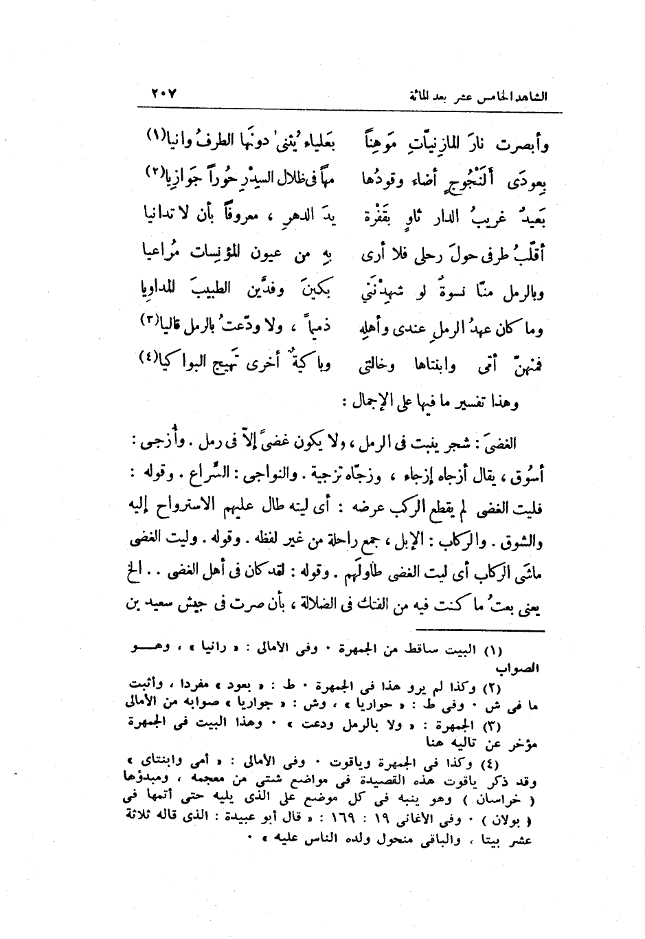 وَهَذَا تَفْسِير مَا فِيهَا على الْإِجْمَال: الغضى: شجر ينْبت فِي الرمل وَلَا يكون غضى إِلَّا فِي رمل. وأزجي: أسوق يُقَال)