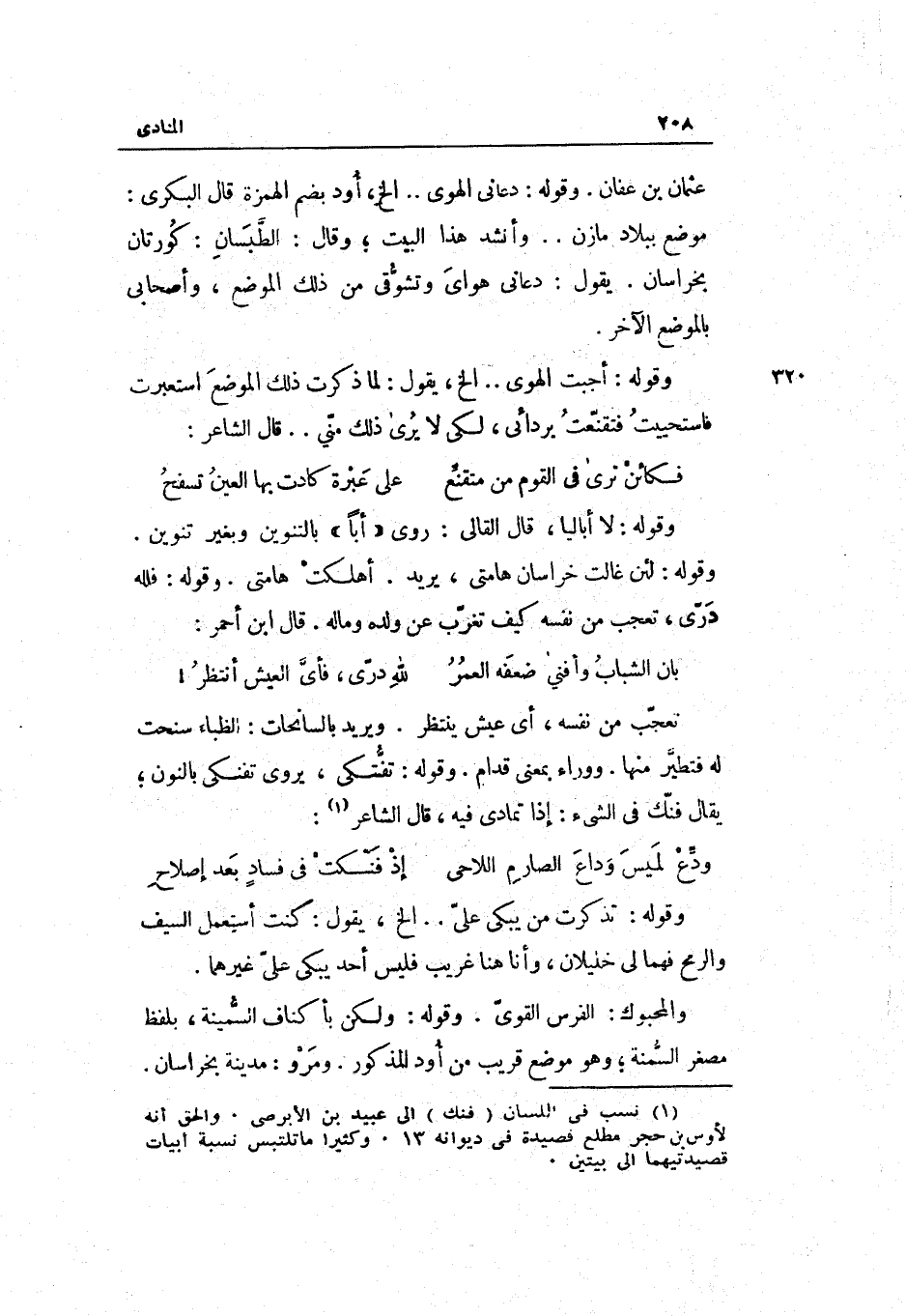 وَقَوله: لَا أَبَا ليا قَالَ القالي: روى أَبَا بِالتَّنْوِينِ وَبِغير تَنْوِين. وَقَوله: لَئِن غالت خُرَاسَان هامتي يُرِيد. أهلكت هامتي. وَقَوله: فَللَّه دري تعجب من نَفسه كَيفَ تغرب عَن وَلَده وَمَاله. قَالَ ابْن أَحْمَر: