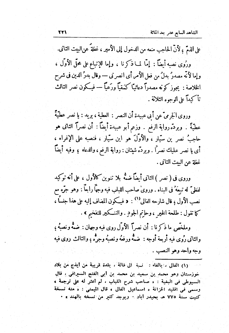 وروى الْجرْمِي عَن أبي عُبَيْدَة أَن النَّصْر: الْعَطِيَّة يُرِيد: يَا نصر عَطِيَّة عَطِيَّة. وَيَردهُ رِوَايَة وَزعم أَبُو عُبَيْدَة أَيْضا: أَن نصرا الثَّانِي هُوَ حَاجِب نصر بن سيار وَالْأول هُوَ ابْن سيار فنصبه على الإغراء أَي: يَا نصر عَلَيْك نصرا. وَيَردهُ شَيْئَانِ: رِوَايَة الرّفْع وَالدُّعَاء وَفِيه أَيْضا غَفلَة عَن الْبَيْت الثَّانِي.