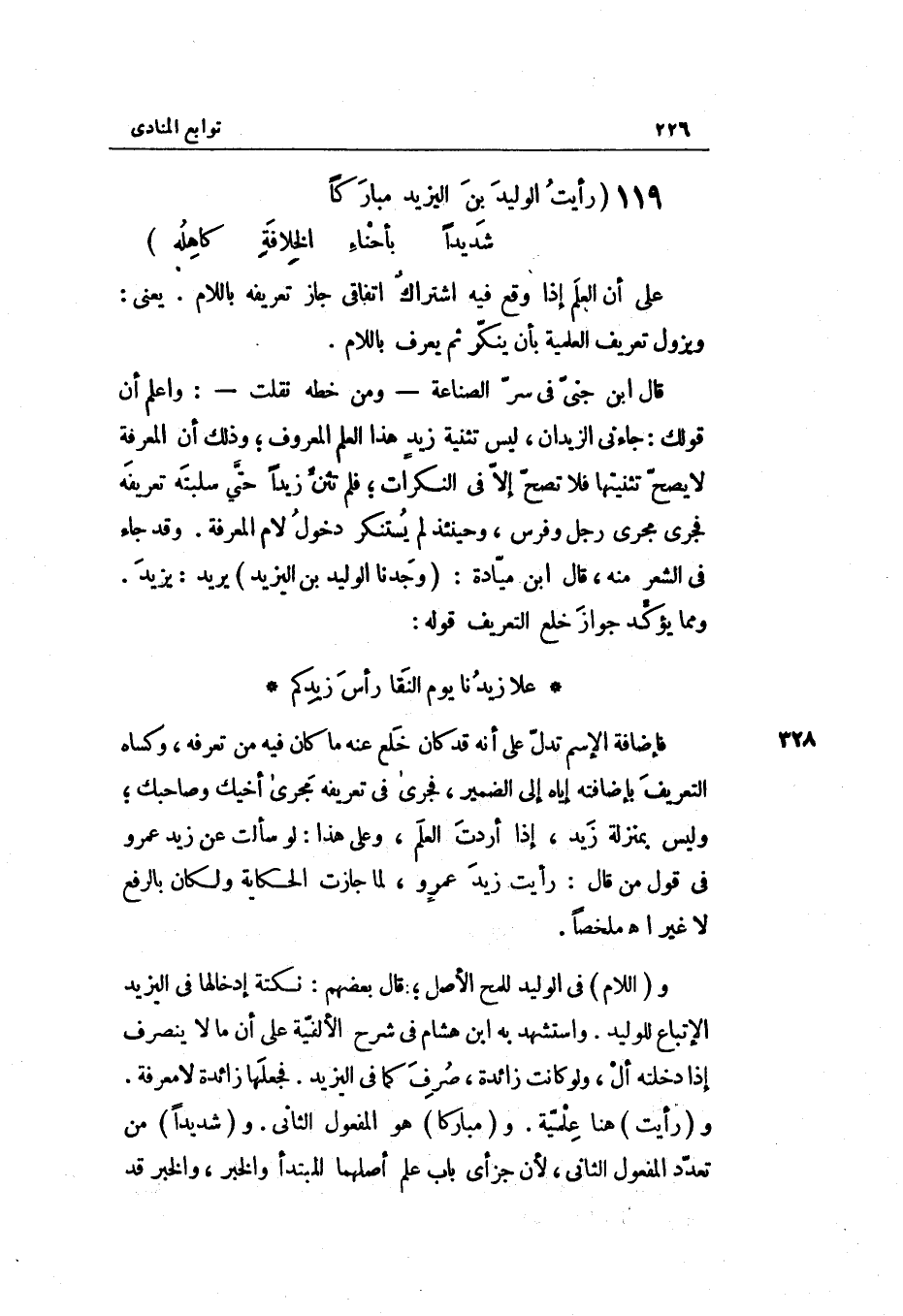 رَأَيْت زيد عمرٍ ولما جَازَت الْحِكَايَة ولكان بِالرَّفْع لَا غير ا. هـ مُلَخصا. واللَّام فِي الْوَلِيد للمح الأَصْل قَالَ بَعضهم: نُكْتَة إدخالها فِي اليزيد الإتباع للوليد. وَاسْتشْهدَ بِهِ ابْن هِشَام فِي شرح الألفية على أَن مَا لَا ينْصَرف إِذا دَخلته أل وَلَو كَانَت زَائِدَة صرف كَمَا فِي اليزيد. فَجَعلهَا زَائِدَة لَا معرفَة. ورَأَيْت هُنَا علمية. ومُبَارَكًا هُوَ الْمَفْعُول الثَّانِي. وشَدِيدا من تعدد الْمَفْعُول الثَّانِي لِأَن جزأي بَاب علم أَصلهمَا الْمُبْتَدَأ وَالْخَبَر وَالْخَبَر قد