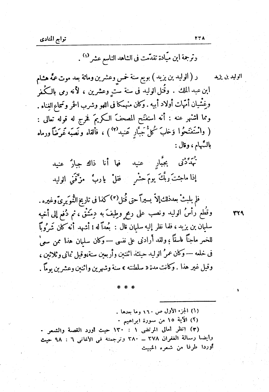 وترجمة ابْن ميادة تقدّمت فِي الشَّاهِد التَّاسِع عشر. والْوَلِيد بن يزِيد بُويِعَ سنة خمس وَعشْرين وَمِائَة بعد موت عَمه هِشَام بن عبد الْملك. وَقتل الْوَلِيد فِي سنة سِتّ وَعشْرين لِأَنَّهُ رمي بالْكفْر وغشيان أُمَّهَات أَوْلَاد أَبِيه. وَكَانَ منهمكاً فِي اللَّهْو وَشرب الْخمر وَسَمَاع الْغناء. وَمِمَّا اشْتهر عَنهُ: أَنه استفتح الْمُصحف الْكَرِيم فَخرج لَهُ قَوْله تَعَالَى: واستفتحوا وخاب كل جبارٍ عنيد فَأَلْقَاهُ ونصبه غَرضا ورماه بِالسِّهَامِ وَقَالَ: