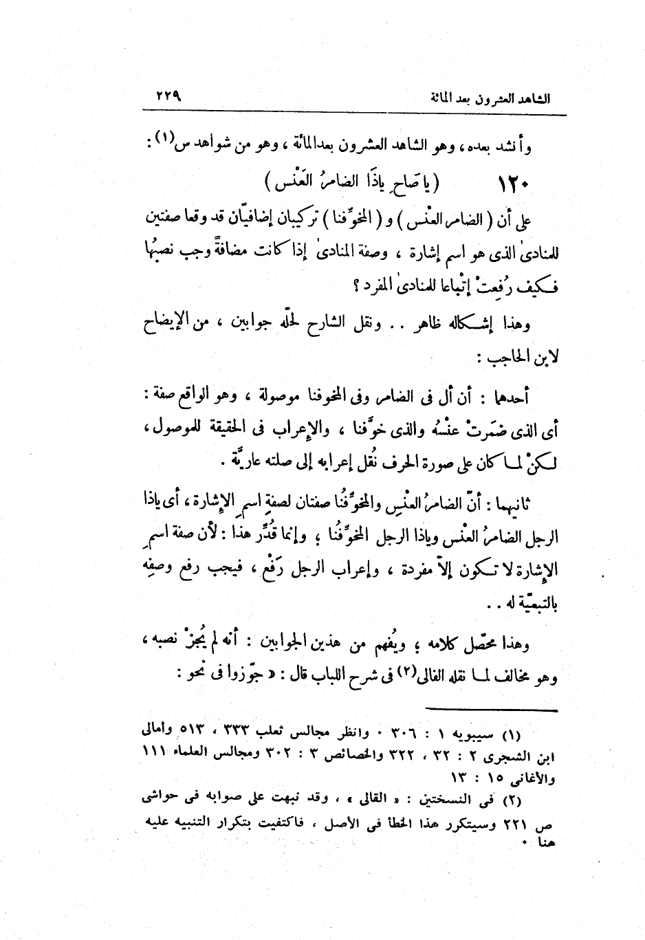 وَهُوَ من شَوَاهِد س: يَا صَاح يَا ذَا الضامر العنس على أَن الضامر العنس والمخوفنا تركيبان إضافيان قد وَقعا صفتين للمنادى الَّذِي هُوَ اسْم إِشَارَة وَصفَة المنادى إِذا كَانَت مُضَافَة وَجب نصبها فَكيف رفعت إتباعاً للمنادى الْمُفْرد وَهَذَا إشكاله ظَاهر ... وَنقل الشَّارِح لِحلِّهِ جوابين من الْإِيضَاح لِابْنِ الْحَاجِب: أَحدهمَا: أَن أل فِي الضامر وَفِي المخوفنا مَوْصُولَة وَهُوَ الْوَاقِع صفة: أَي: الَّذِي ضمرت عنسه وَالَّذِي خوفنا وَالْإِعْرَاب فِي الْحَقِيقَة للموصول لَكِن لما كَانَ على صُورَة الْحَرْف نقل إعرابه إِلَى صلته عَارِية.