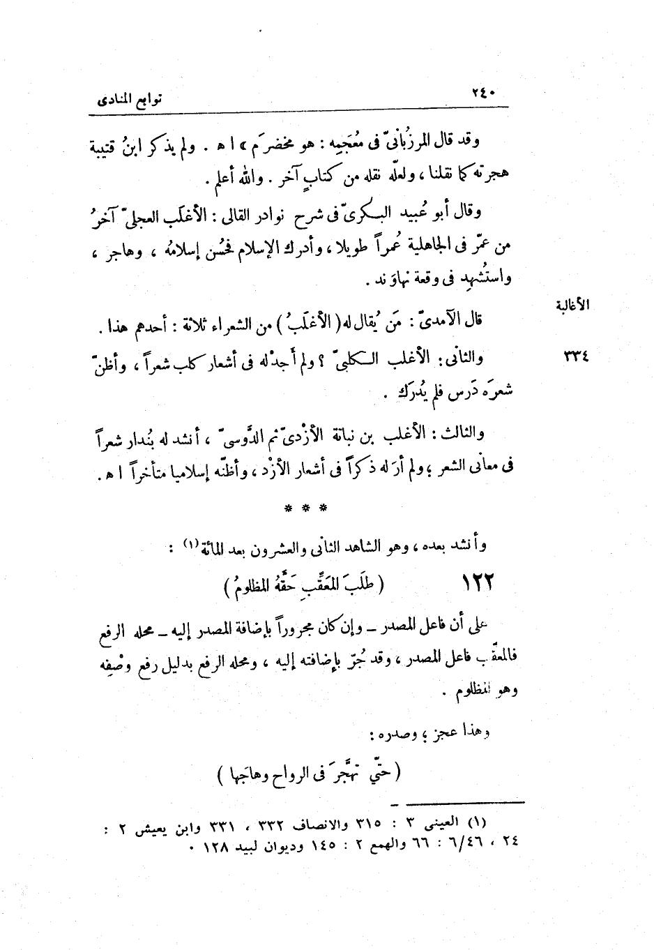 طلب المعقب حَقه الْمَظْلُوم على أَن فَاعل الْمصدر وَإِن كَانَ مجروراً بِإِضَافَة الْمصدر إِلَيْهِ مَحَله الرّفْع فالمعقب فَاعل وَهَذَا عجز وصدره: حَتَّى تهجر فِي الرواح وهاجها