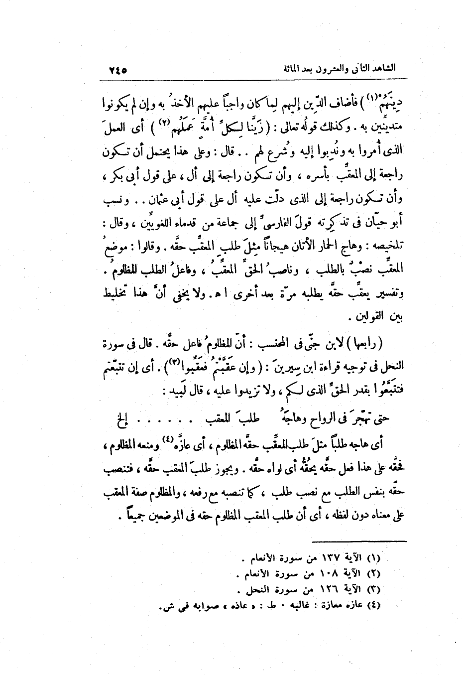 وَلَا يخفى أَن هَذَا تَخْلِيط بَين الْقَوْلَيْنِ. رَابِعهَا لِابْنِ جني فِي الْمُحْتَسب: أَن الْمَظْلُوم فَاعل حَقه. قَالَ فِي سُورَة النَّحْل فِي تَوْجِيه قِرَاءَة ابْن سِيرِين: وَإِن عقبتم فعقبوا. أَي: إِن تتبعتم فتتبعوا بِقدر الْحق الَّذِي لكم وَلَا تَزِيدُوا عَلَيْهِ قَالَ لبيد: