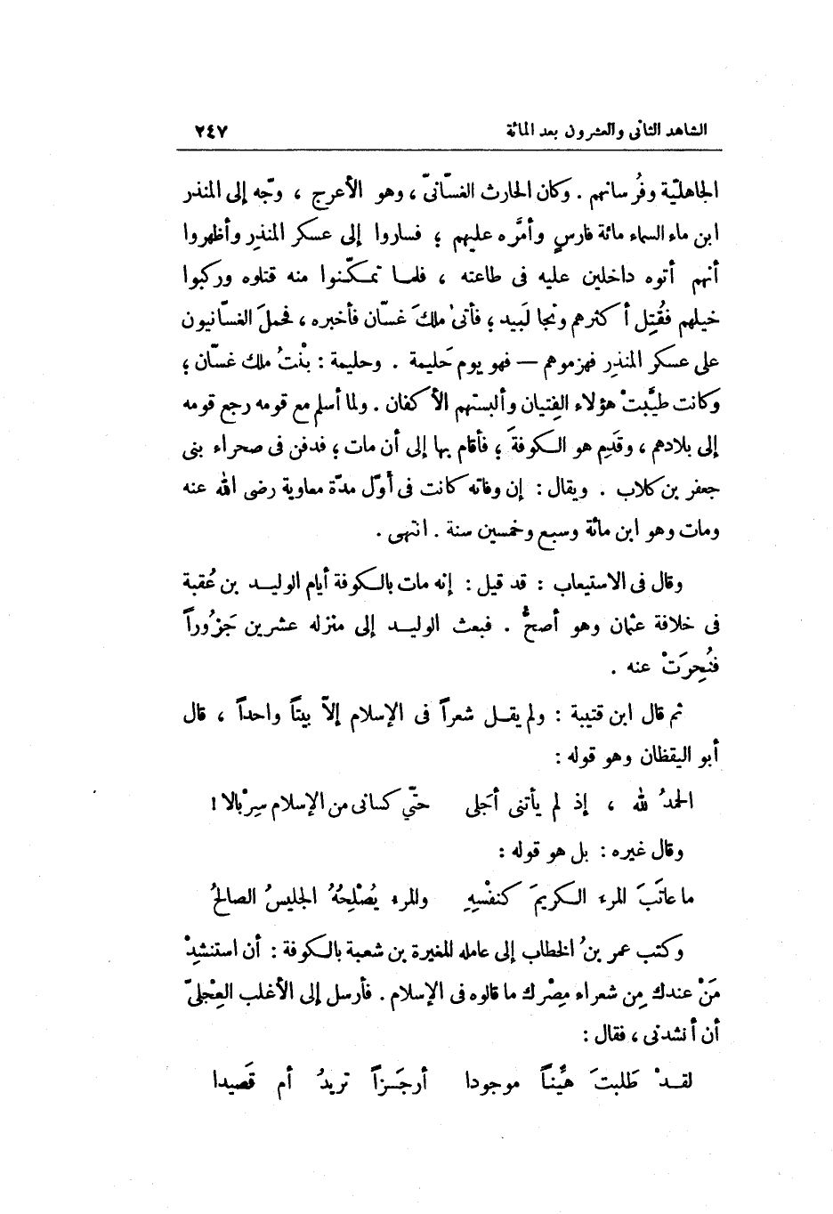 وَكتب عمر بن الْخطاب إِلَى عَامله الْمُغيرَة بن شُعْبَة بِالْكُوفَةِ: أَن استنشد من عنْدك من شعراء مصرك مَا قَالُوهُ فِي الْإِسْلَام. فَأرْسل إِلَى الْأَغْلَب الْعجلِيّ أَن أَنْشدني فَقَالَ: