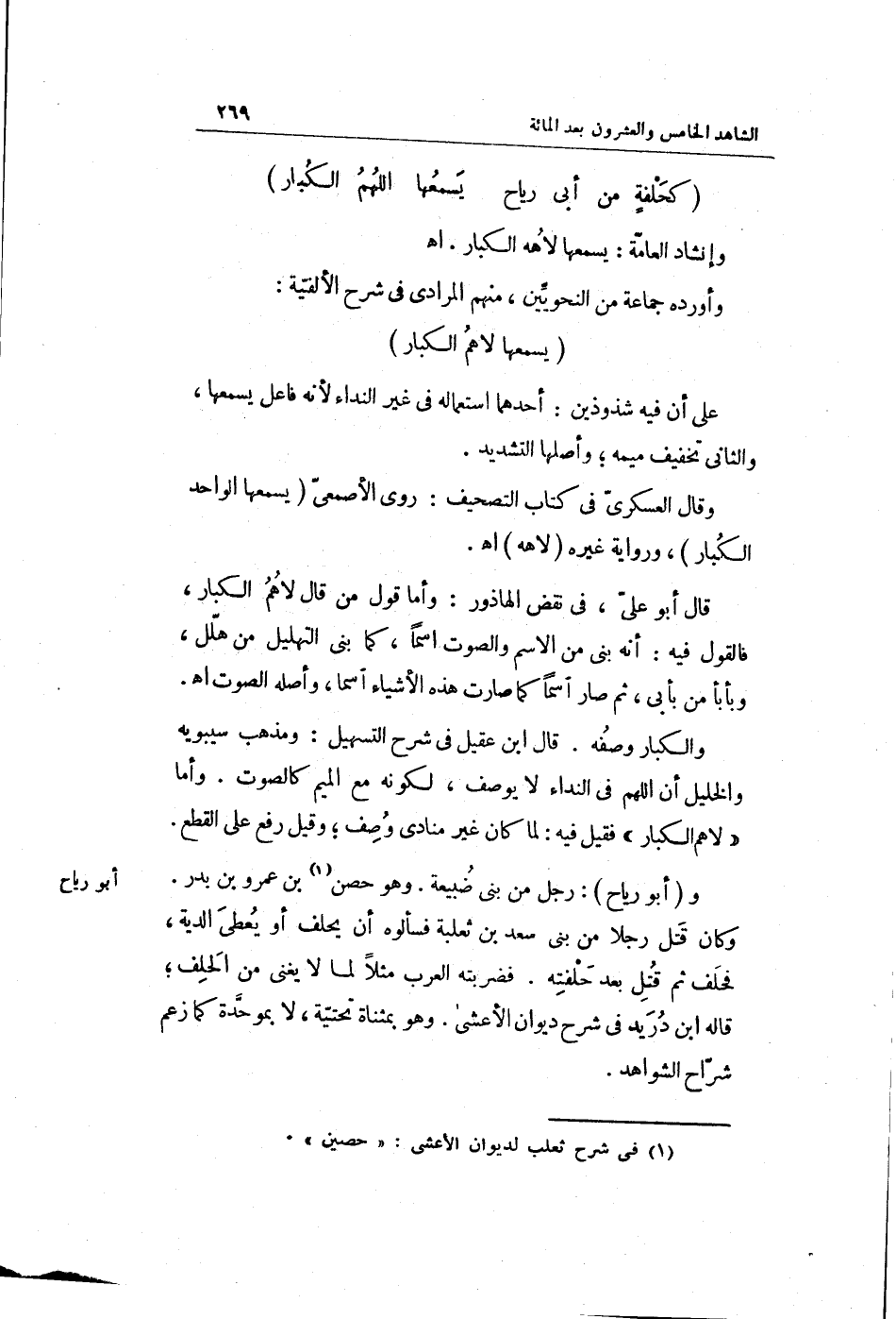 والكبار وَصفه. قَالَ ابْن عقيل فِي شرح التسهيل: وَمذهب سِيبَوَيْهٍ والخليل أَن اللَّهُمَّ فِي النداء لَا يُوصف لكَونه مَعَ الْمِيم كالصوت. وَأما لاهم الْكِبَار فَقيل فِيهِ: لما كَانَ غير منادى وصف وَقيل رفع على الْقطع. وأَبُو ريَاح رجل من بني ضبيعة. وَهُوَ حصن بن عَمْرو بن بدر. وَكَانَ قتل رجلا من بني سعد بن ثَعْلَبَة فَسَأَلُوهُ أَن يحلف أَو يُعْطي الدِّيَة فَحلف ثمَّ قتل بعد حلفته. فضربته الْعَرَب مثلا لما لَا يُغني من الْحلف قَالَه ابْن دُرَيْد فِي شرح ديوَان الْأَعْشَى. وَهُوَ بمثناة تحتية لَا بموحدة كَمَا زعم شرَّاح الشواهد.