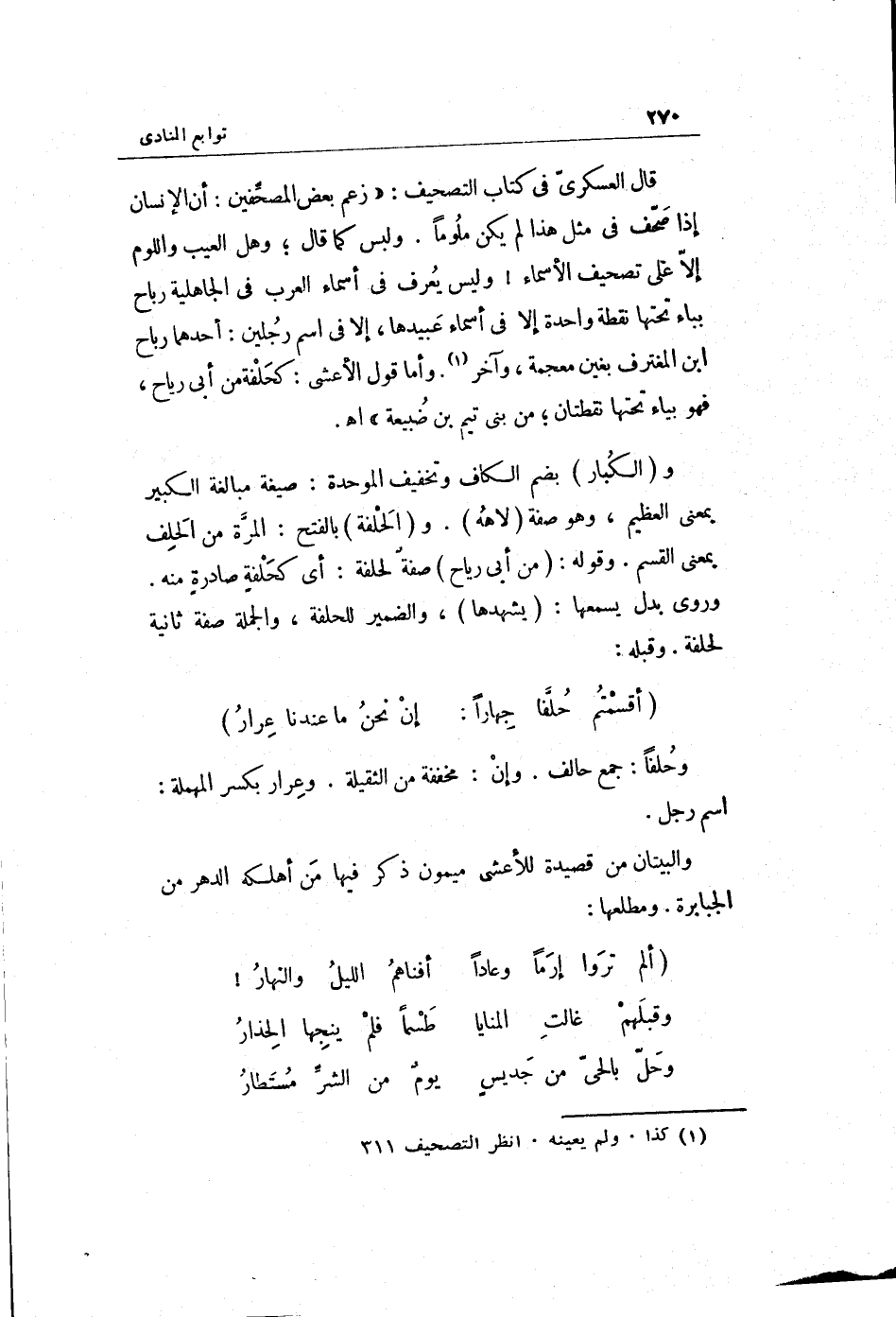 قَالَ العسكري فِي كتاب التَّصْحِيف: زعم بعض المصحفين: أَن الْإِنْسَان إِذا صحف فِي مثل هَذَا لم يكن ملوماً. وَلَيْسَ كَمَا قَالَ وَهل الْعَيْب واللوم إِلَّا على تَصْحِيف الْأَسْمَاء وَلَيْسَ يعرف فِي أَسمَاء الْعَرَب فِي الْجَاهِلِيَّة رَبَاح بباء تحتهَا نقطة وَاحِدَة إِلَّا فِي أَسمَاء عبيدها إِلَّا فِي اسْم رجلَيْنِ: أَحدهمَا رَبَاح بن المغترف بغين مُعْجمَة وَآخر. وَأما قَول الْأَعْشَى: كحلفة من أبي ريَاح فَهُوَ بياء تحتهَا نقطتان من بني تيم بن ضبيعة. والْكِبَار بِضَم الْكَاف وَتَخْفِيف الْمُوَحدَة: صِيغَة مُبَالغَة الْكَبِير بِمَعْنى الْعَظِيم وَهُوَ صفة لاهه. والحلفة بِالْفَتْح: الْمرة من الْحلف بِمَعْنى الْقسم.