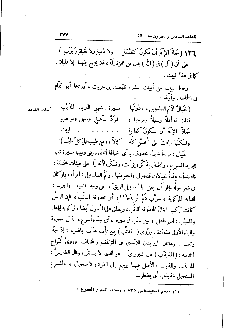 خيال: مُبْتَدأ خَبره مَحْذُوف أَي: خيالها أَتَانِي وبيني وَبَينهَا مسيرَة شهر للبريد المسرع والخيال يذكر وَيُؤَنث ونكره لِأَنَّهُ رَآهُ على هيئات مُخْتَلفَة فَاعْتقد أَنه عدَّة خيالات قصد إِلَى وَاحِد مِنْهَا. وأم السلسبيل: امْرَأَة وَلَو كَانَ فِي شعر مولد لجَاز أَن يعْنى بالسلسبيل الرِّيق على وَجه التَّشْبِيه. والْبَرِيد: الدَّابَّة المركوبة مُعرب دم بريده أَي: محذوفة الذَّنب فَإِن الرُّسُل كَانَت تركب البغال المحذوفة الذَّنب وَيُطلق على الرَّسُول أَيْضا لركوبه إِيَّاهَا. والمذبب: اسْم فَاعل من ذبب فِي سيره أَي: جد وأسرع بذال مُعْجمَة وَالْبَاء الأولى مُشَدّدَة. وَرُوِيَ: المدئب من دأب يدأب بِالْهَمْزَةِ: إِذا وجد التَّعَب. وَهَاتَانِ الرِّوَايَتَانِ للآمدي فِي المؤتلف والمختلف.