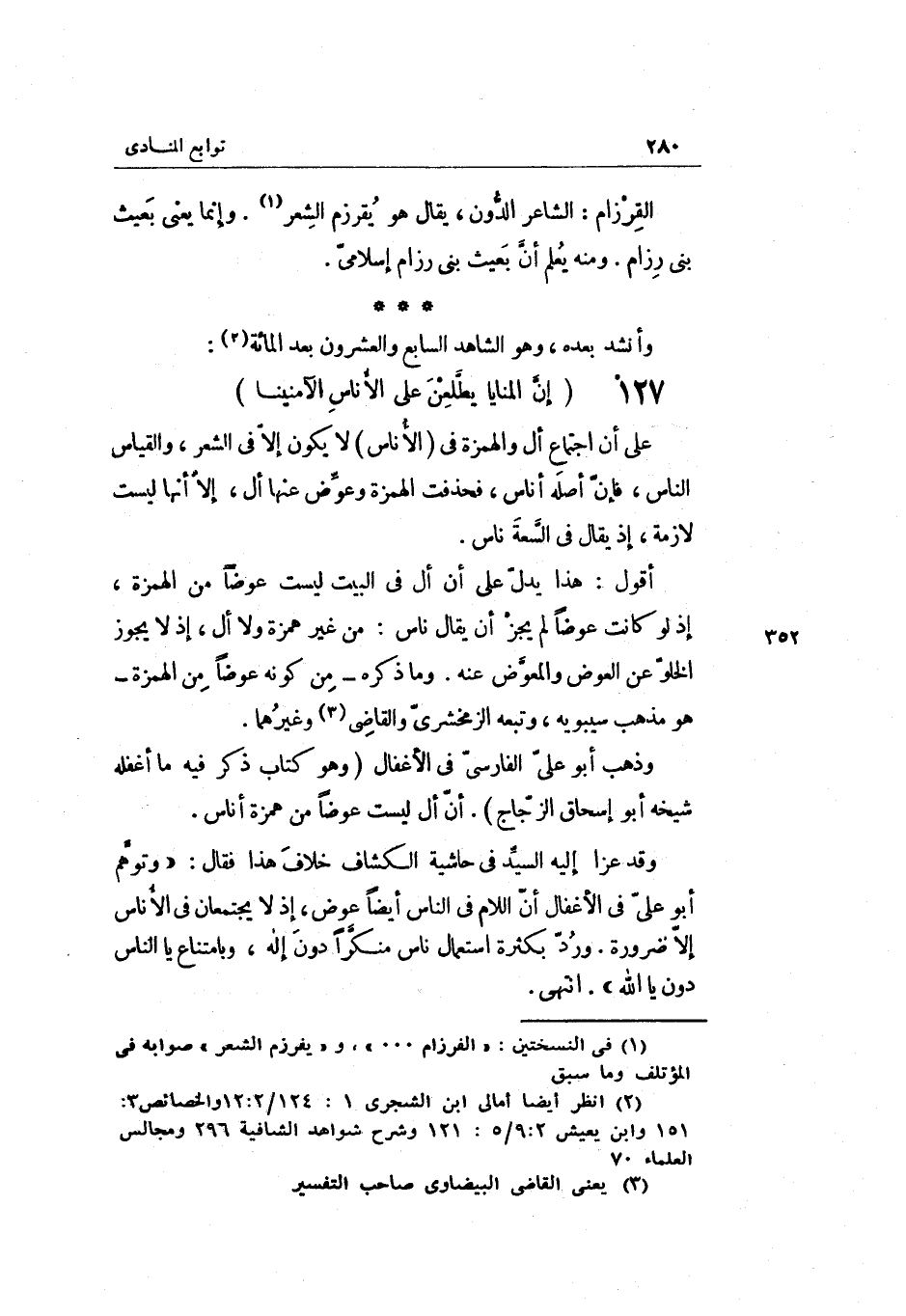 أَقُول: هَذَا يدل على أَن أل فِي الْبَيْت لَيست عوضا من الْهمزَة إِذْ لَو كَانَت عوضا لم يجز أَن يُقَال نَاس: من غير همزَة وَلَا أل إِذْ لَا يجوز الْخُلُو عَن الْعِوَض والمعوض عَنهُ. وَمَا ذكره من كَونه عوضا من الْهمزَة هُوَ مَذْهَب سِيبَوَيْهٍ وَتَبعهُ الزَّمَخْشَرِيّ وَالْقَاضِي وَغَيرهمَا.