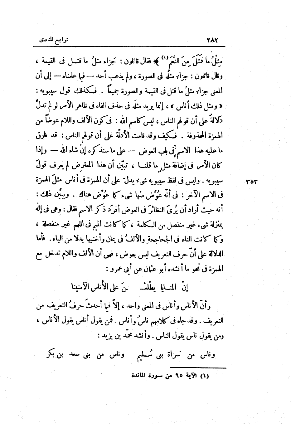 فَكيف وَقد قَامَت الْأَدِلَّة على أَن قَوْلهم النَّاس: قد فَارق مَا عَلَيْهِ هَذَا الِاسْم فِي بَاب الْعِوَض على مَا سَنذكرُهُ إِن شَاءَ الله وَإِذا كَانَ الْأَمر فِي إِضَافَة مثل مَا قُلْنَا تبين أَن هَذَا الْمُعْتَرض لم يعرف قَول سِيبَوَيْهٍ. وَلَيْسَ فِي لفظ سِيبَوَيْهٍ شَيْء يدل على أَن الْهمزَة فِي أنَاس مثل الْهمزَة فِي الِاسْم الآخر: فِي أَنه عوض مِنْهَا شَيْء كَمَا عوض هُنَاكَ. وَيبين ذَلِك: أَنه حَيْثُ أَرَادَ أَن يرى النَّظَائِر فِي الْعِوَض أفرد ذكر الِاسْم فَقَالَ: وَهِي فِي إِلَه بِمَنْزِلَة شَيْء غير مُنْفَصِل من الْكَلِمَة كَمَا كَانَت الْمِيم فِي اللَّهُمَّ غير مُنْفَصِلَة وكما كَانَت التَّاء فِي الجحاجحة وَالْألف فِي يمَان وأختيها بَدَلا من الْيَاء. فَأَما الدّلَالَة على أَن حرف التَّعْرِيف لَيْسَ بعوض فَهِيَ أَن الْألف وَاللَّام تدخل مَعَ