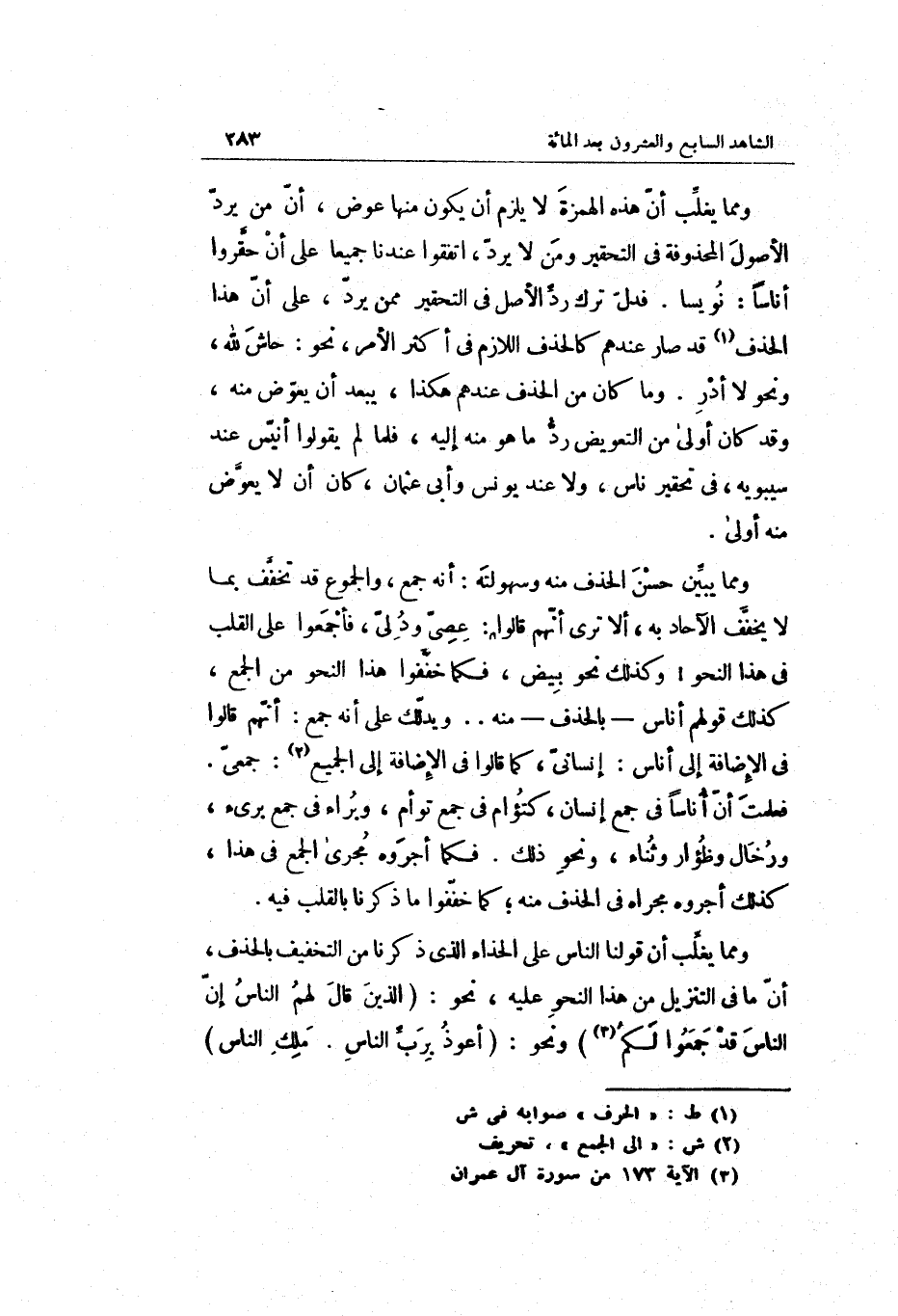 مِمَّن يرد على أَن هَذَا الْحَذف قد صَار عِنْدهم كالحذف اللَّازِم فِي أَكثر الْأَمر نَحْو: حاش لله وَنَحْو لَا أدر. وَمَا كَانَ من الْحَذف عِنْدهم هَكَذَا يبعد أَن يعوض مِنْهُ وَقد كَانَ أولى من التعويض رد مَا هُوَ مِنْهُ إِلَيْهِ فَلَمَّا لم يَقُولُوا أنيس عِنْد سِيبَوَيْهٍ فِي تحقير نَاس وَلَا عِنْد يُونُس وَأبي عُثْمَان كَانَ أَن لَا يعوض مِنْهُ أولى.