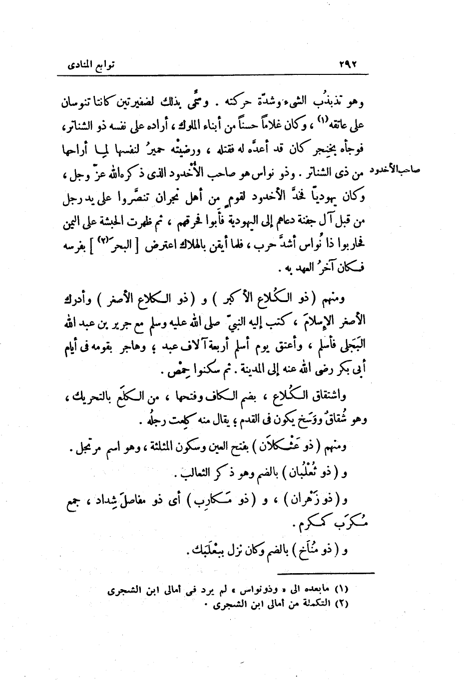 وَمِنْهُم ذُو عثكلان بِفَتْح الْعين وَسُكُون الْمُثَلَّثَة وَهُوَ اسْم مرتجل. وذُو ثعلبان بِالضَّمِّ وَهُوَ ذكر الثعالب. وذُو زهران وذُو مكارب أَي: ذُو مفاصل شَدَّاد جمع مكرب كمكرم. وذُو مناخ بِالضَّمِّ وَكَانَ نزل ببعلبك.