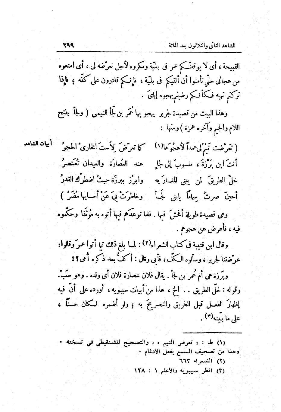 وَقَالَ ابْن قُتَيْبَة فِي كتاب الشُّعَرَاء: لما بلغ ذَلِك تيماً أَتَوا عمر وَقَالُوا: عرضتنا لجرير وسألوه الْكَفّ فَأبى وَقَالَ: أكف بعد ذكره أُمِّي وبَرزَة هِيَ أم عمر بن لَجأ. يُقَال: فلَان عصارة فلَان أَي: وَلَده. وَهُوَ سبّ. وَقَوله: خل الطَّرِيق. . الخ هَذَا من أَبْيَات سِيبَوَيْهٍ أوردهُ على أَن فِيهِ إِظْهَار الْفِعْل قبل الطَّرِيق وَالتَّصْرِيح بِهِ وَلَو أضمره لَكَانَ حسنا على مَا بَينه.