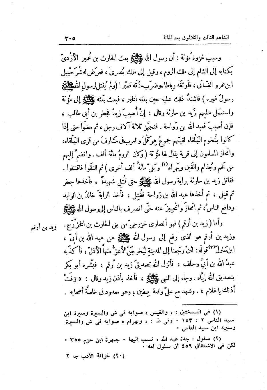 وَأما زيد بن أَرقم فَهُوَ أَنْصَارِي خزرجي من بني الْحَارِث بن الْخَزْرَج. وَزيد ابْن أَرقم هُوَ الَّذِي رفع إِلَى رَسُول الله صَلَّى اللَّهُ عَلَيْهِ وَسَلَّم َ عَن عبد الله بن أبي ابْن سلول قَوْله: لَئِن رَجعْنَا)